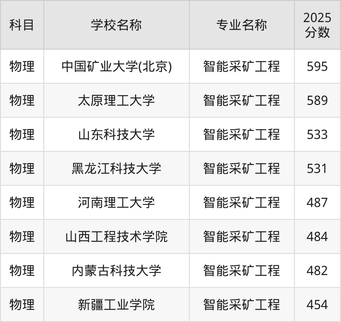 通过上文大家可以知晓,在辽宁省内招智能采矿工程专业的院校数量较少,所以下文将为2026届高考生继续展示:省外大学的智能采矿工程专业2025年在辽宁高考的录取情况,包含中国矿业大学(北京)、太原理工大学、山东科技大学、黑龙江科技大学、河南理工大学。