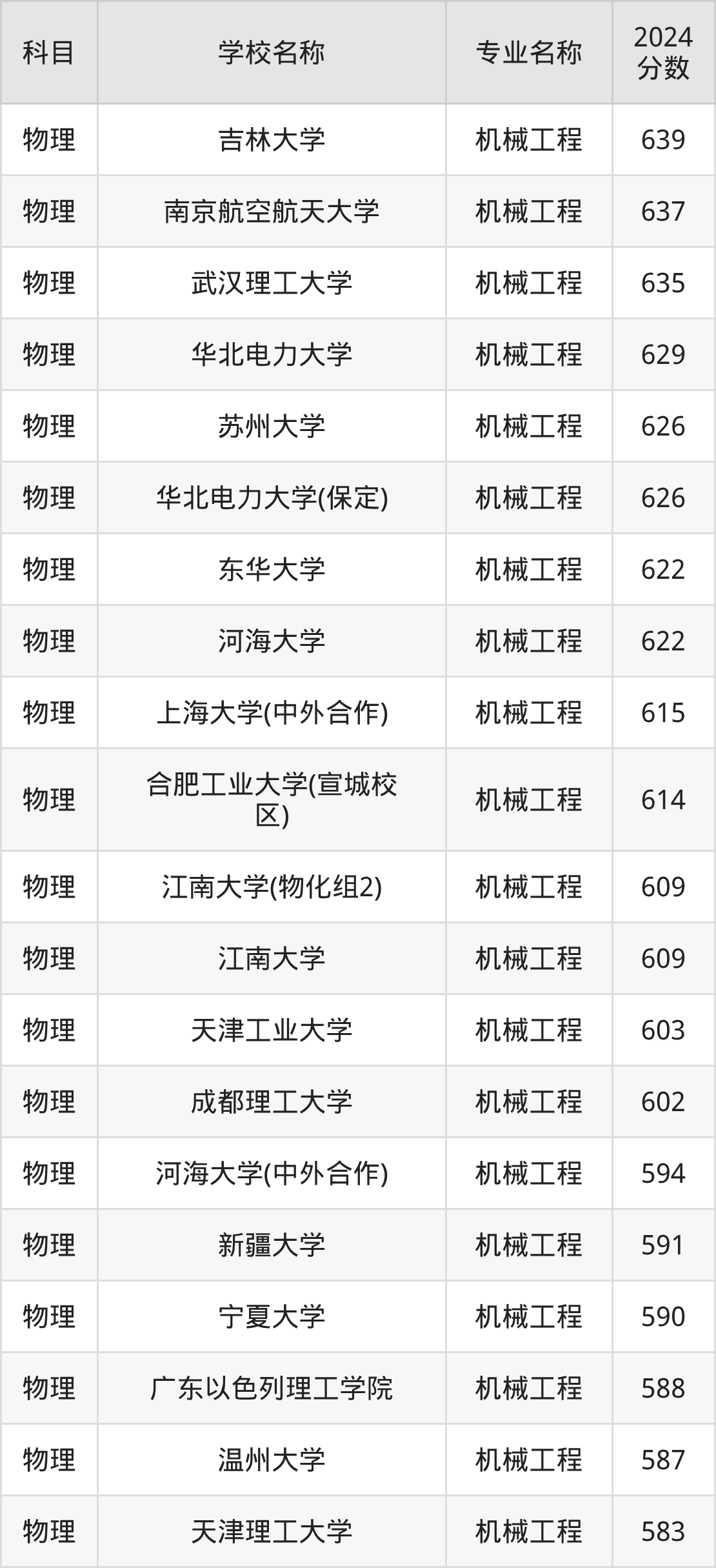 通过上文大家可以知晓,在福建省内招机械工程专业的院校数量较少,所以下文将为2026届高考生继续展示:省外大学的机械工程专业2024年在福建高考的录取情况,包含吉林大学、南京航空航天大学、武汉理工大学、华北电力大学、苏州大学。