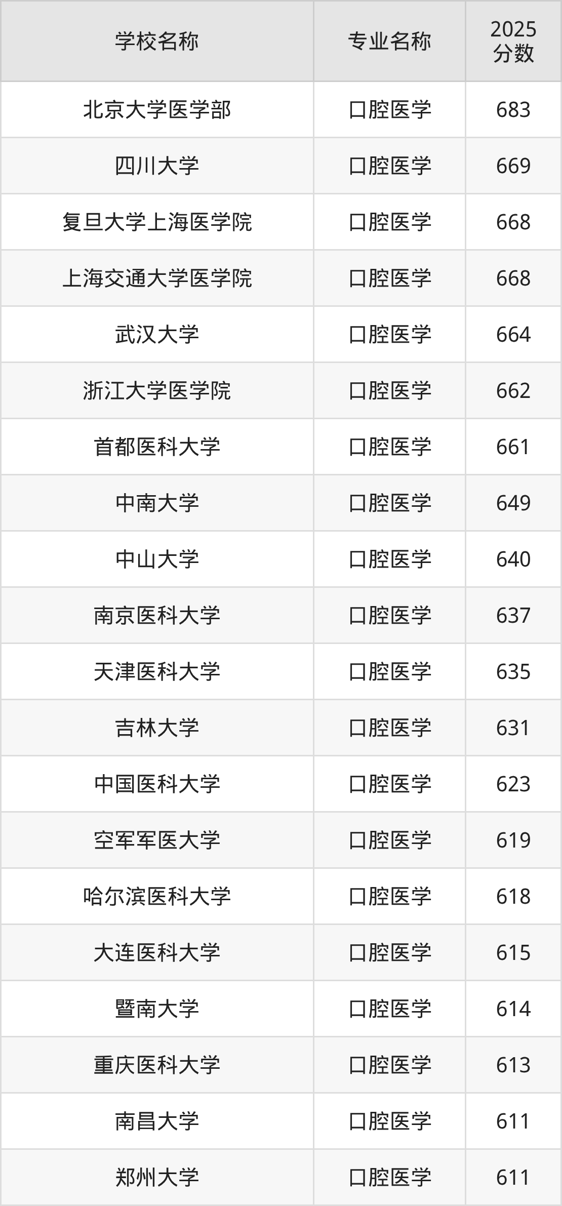 | 山东大学 | 口腔医学 | 632 |