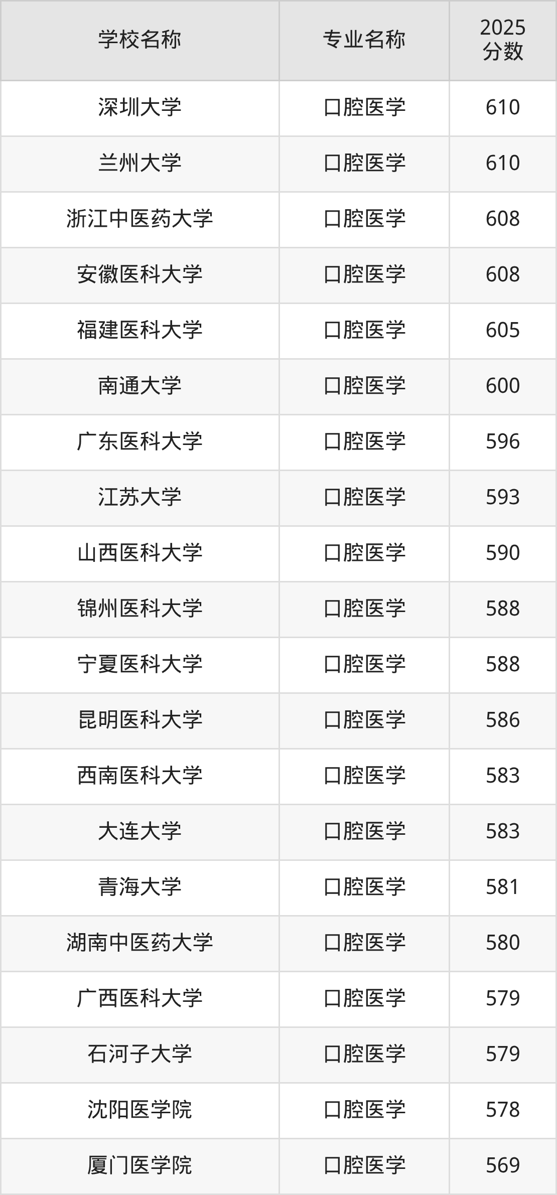 | 山东医药大学 | 口腔医学 | 565 |