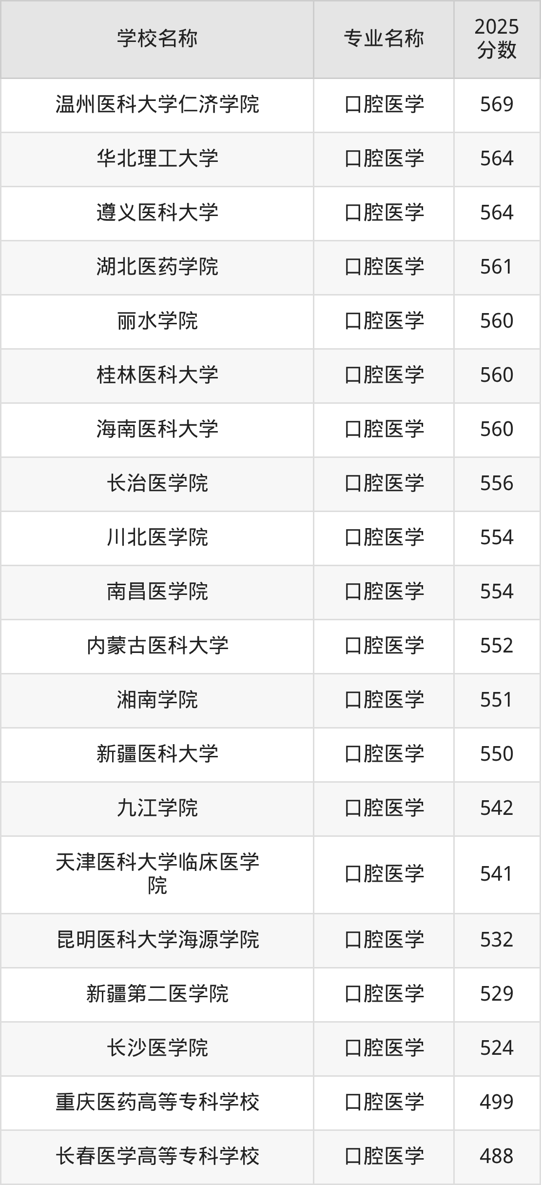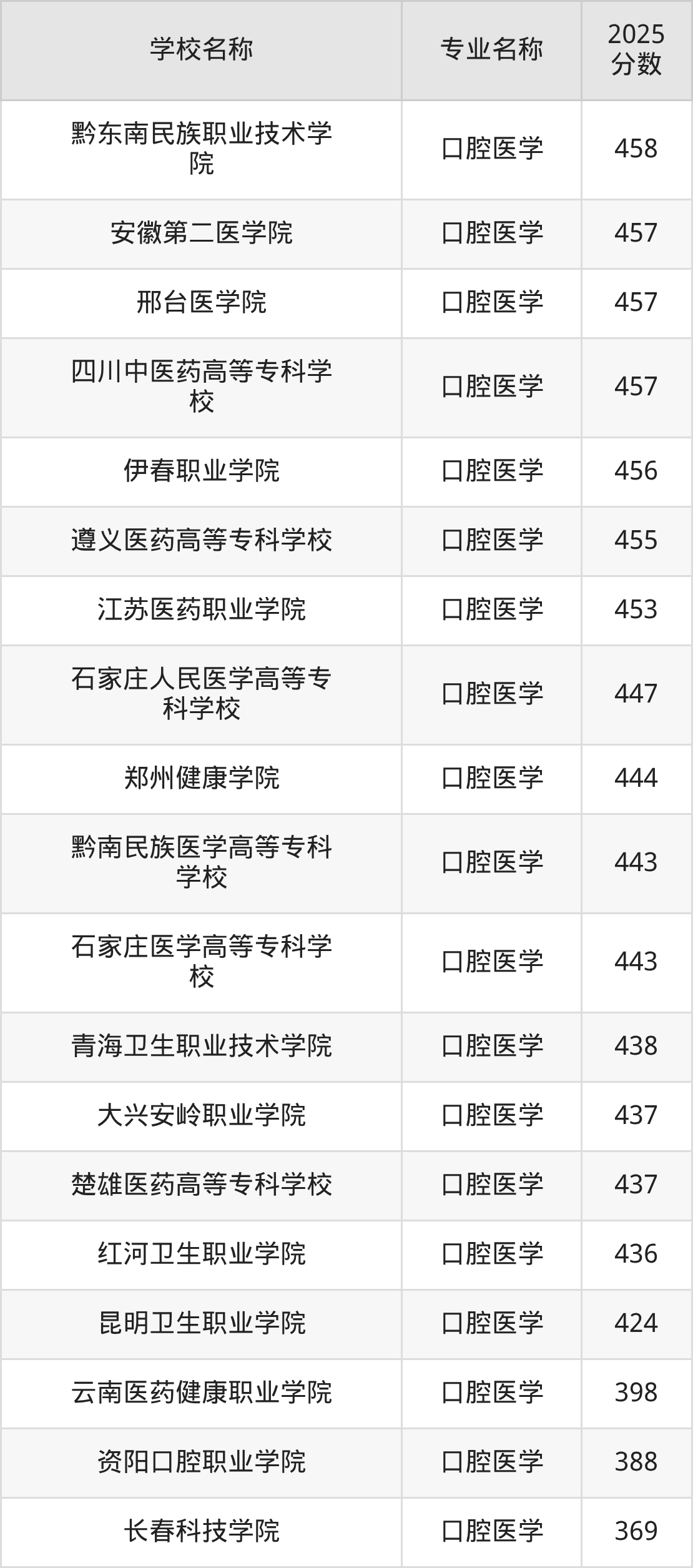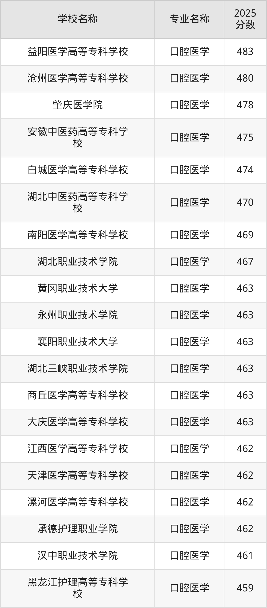 | 枣庄职业学院 | 口腔医学 | 460 |