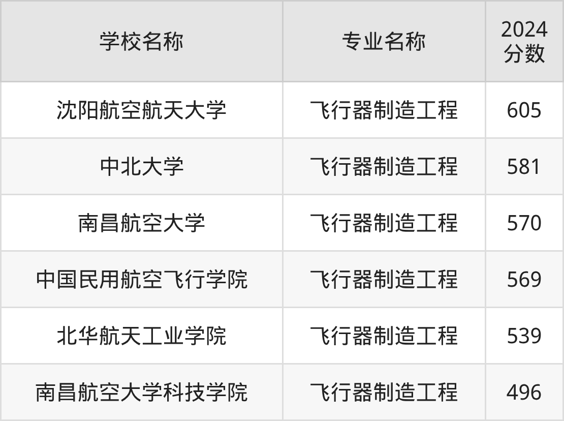通过上文大家可以知晓,在天津市内招飞行器制造工程专业的院校数量较少,所以下文将为2026届高考生继续展示:市外大学的飞行器制造工程专业2024年在天津高考的录取情况,包含沈阳航空航天大学、中北大学、南昌航空大学、中国民用航空飞行学院、北华航天工业学院。