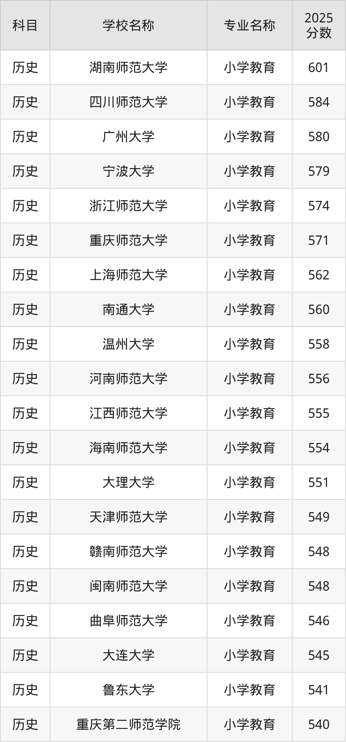 通过上文大家可以知晓,在贵州省内招小学教育专业的院校数量较少,所以下文将为2026届高考生继续展示:省外大学的小学教育专业2025年在贵州高考的录取情况,包含湖南师范大学、四川师范大学、广州大学、宁波大学、浙江师范大学。