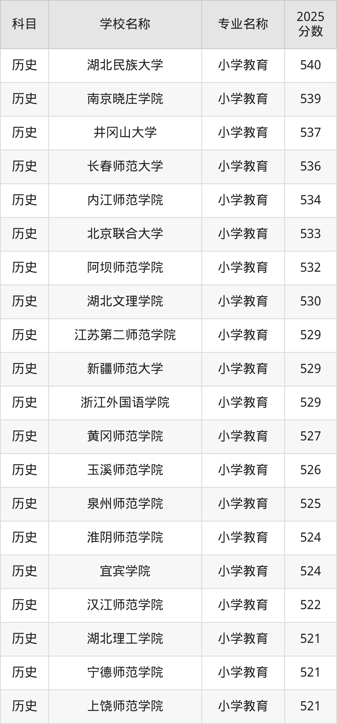 | 遵义师范学院 | 小学教育(师范 类) | 528 |