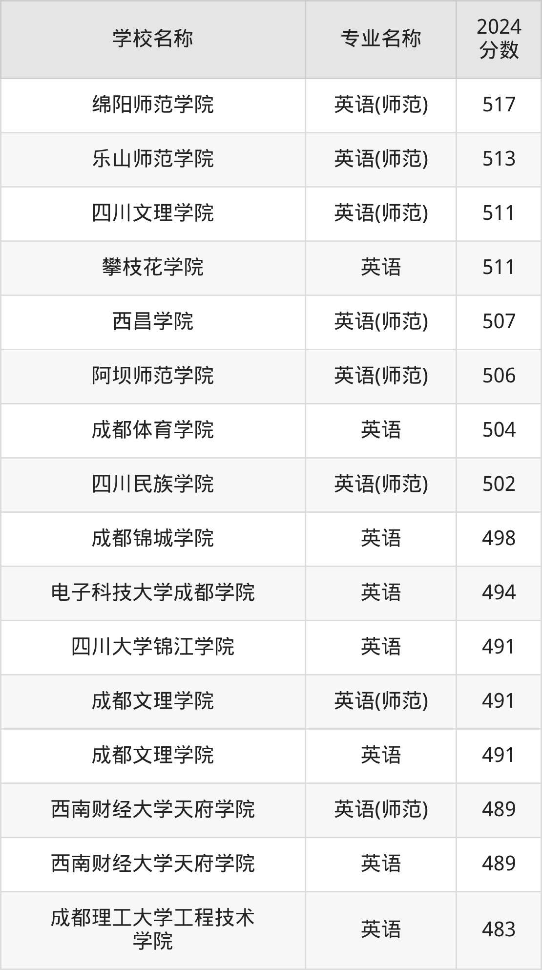 | 电子科技大学成都学院 | 英语 | 490 |