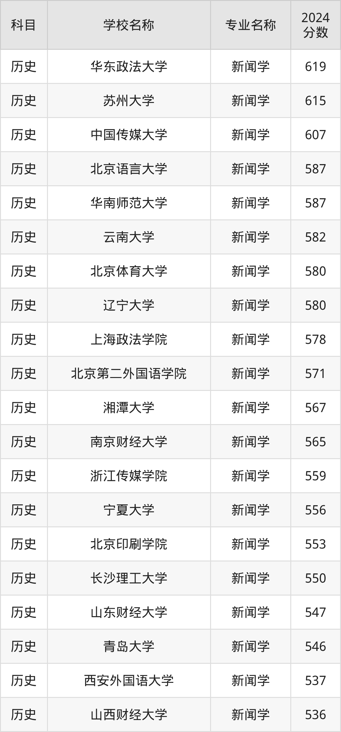 通过上文大家可以知晓,在黑龙江省内招新闻学专业的院校数量较少,所以下文将为2026届高考生继续展示:省外大学的新闻学专业2024年在黑龙江高考的录取情况,包含华东政法大学、苏州大学、中国传媒大学、北京语言大学、华南师范大学。
