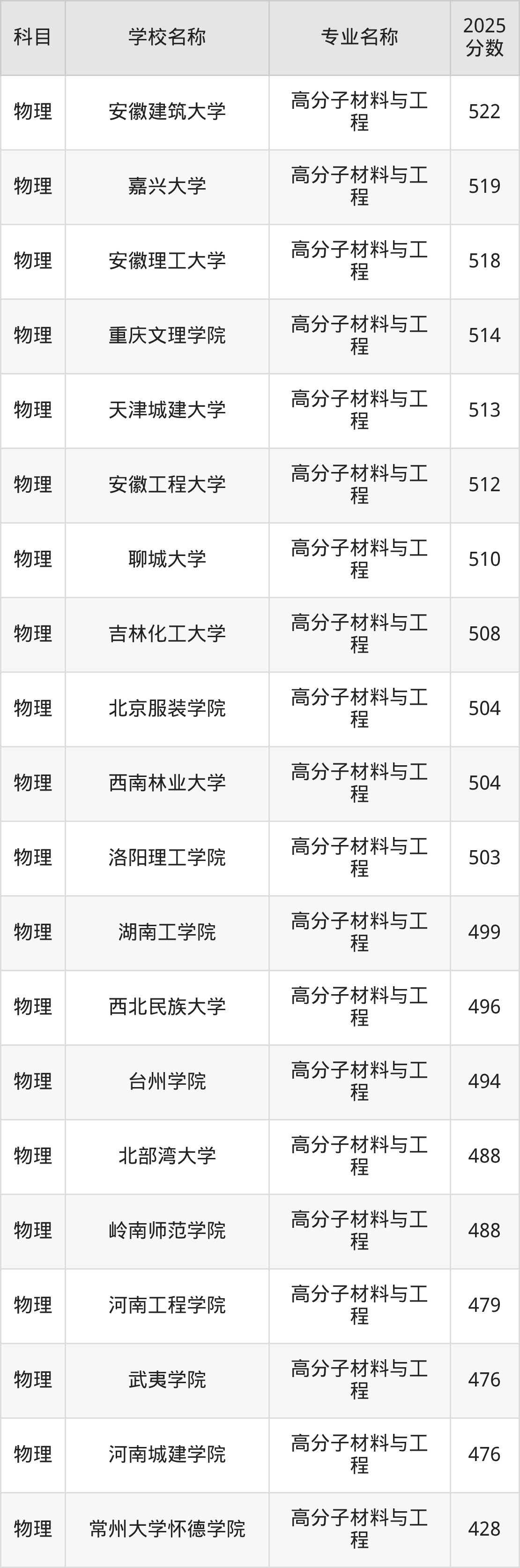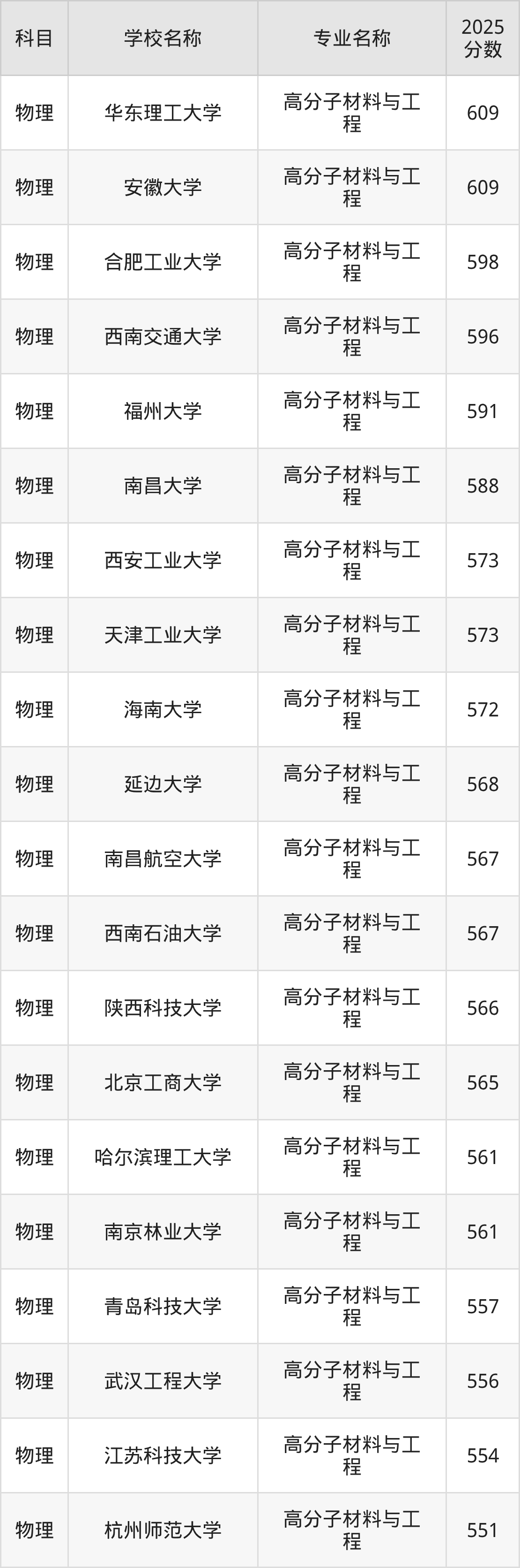 通过上文大家可以知晓,在山西省内招高分子材料与工程专业的院校数量较少,所以下文将为2026届高考生继续展示:省外大学的高分子材料与工程专业2025年在山西高考的录取情况,包含华东理工大学、安徽大学、合肥工业大学、西南交通大学、福州大学。