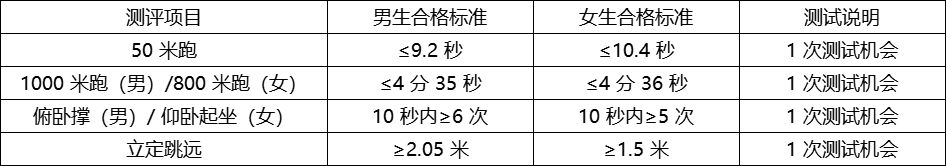 提前批考生需参加体能测评,四个项目中三项达标即为合格,未合格者无法进入录取环节,2025 年标准可作为 2026 年参考: