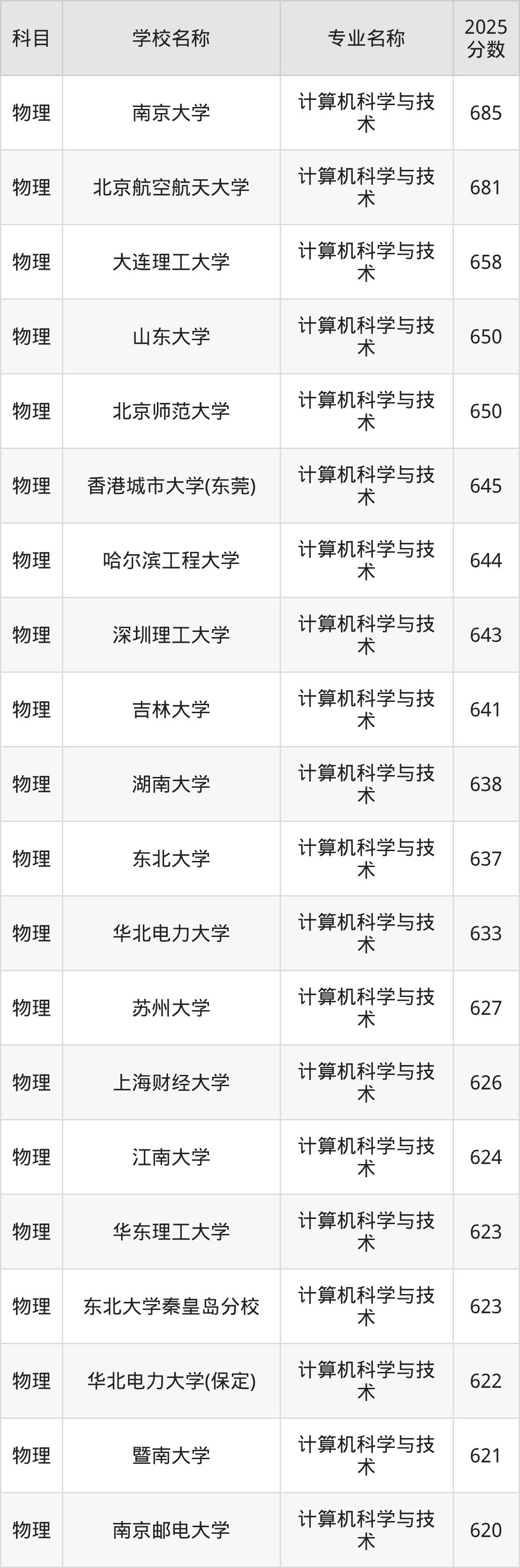 通过上文大家可以知晓,在内蒙古自治区内招计算机科学与技术专业的院校数量较少,所以下文将为2026届高考生继续展示:自治区外大学的计算机科学与技术专业2025年在内蒙古高考的录取情况,包含南京大学、北京航空航天大学、大连理工大学、山东大学、北京师范大学。