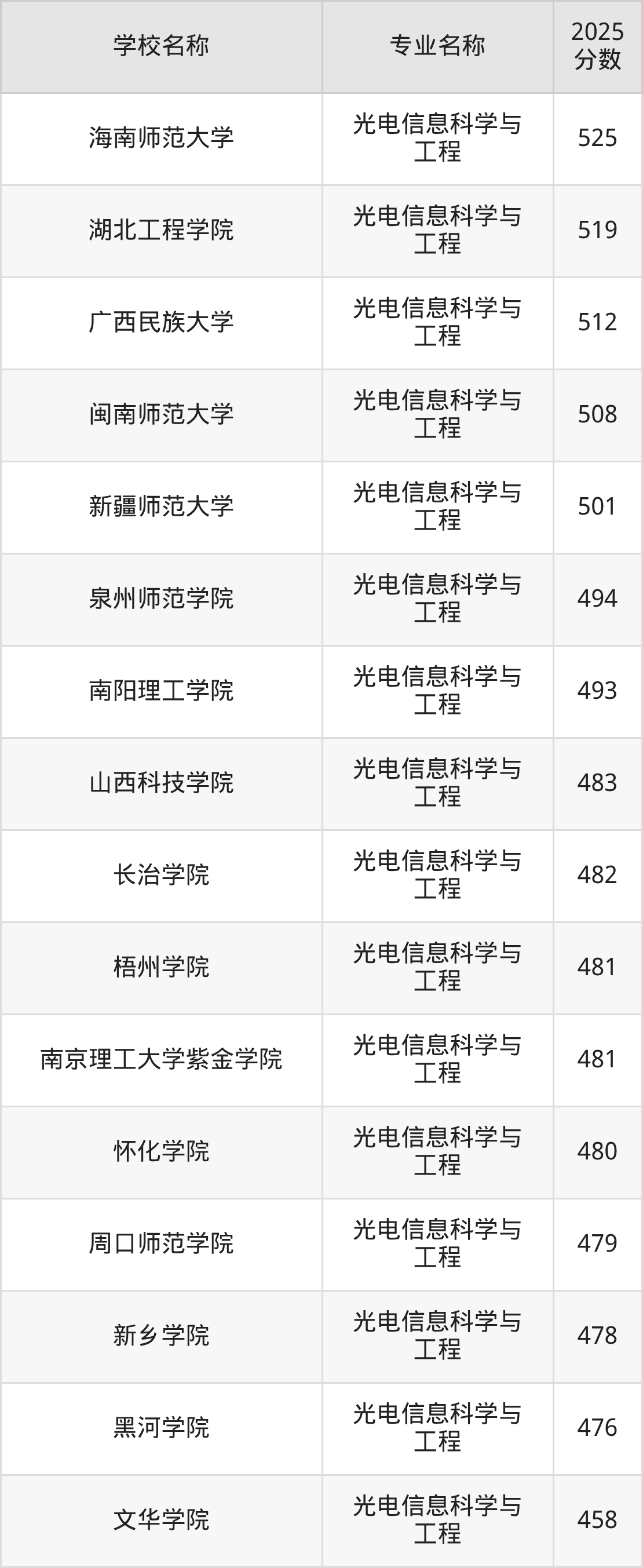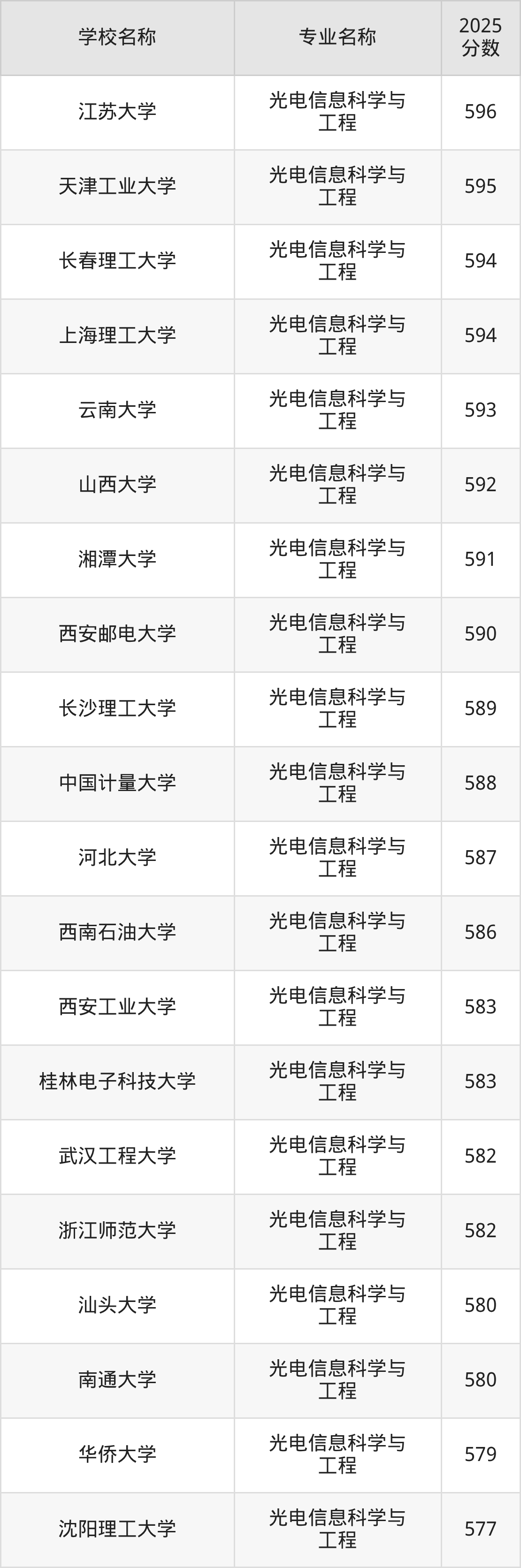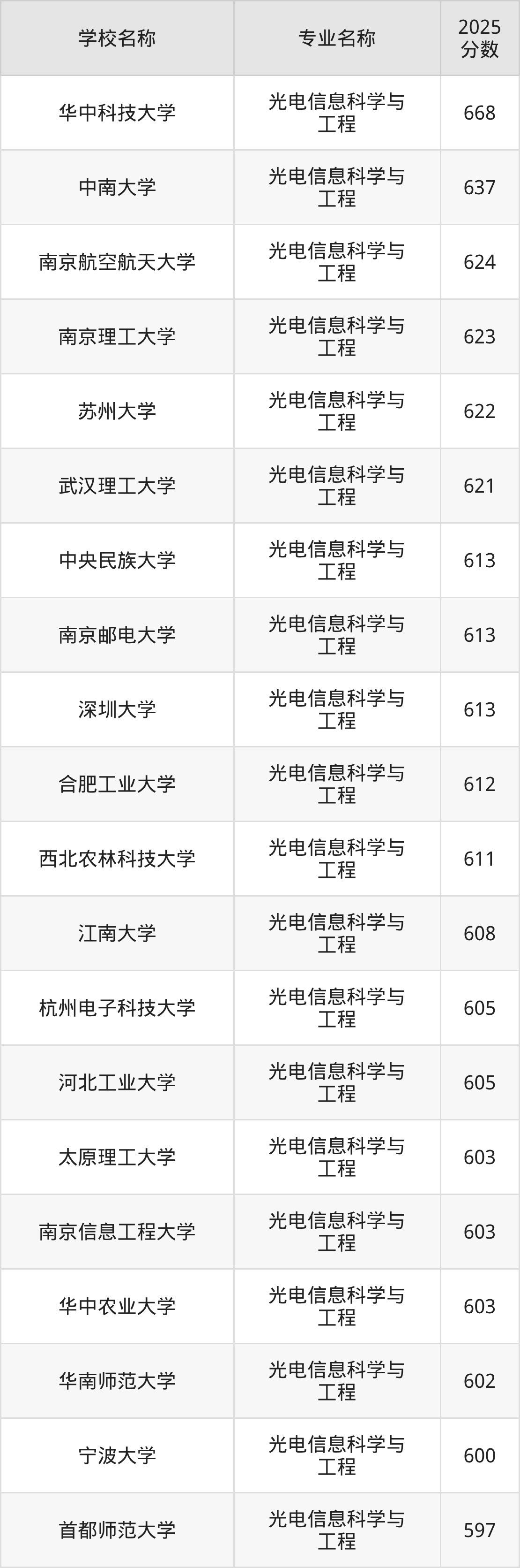 通过上文大家可以知晓,在山东省内招光电信息科学与工程专业的院校数量较少,所以下文将为2026届高考生继续展示:省外大学的光电信息科学与工程专业2025年在山东高考的录取情况,包含华中科技大学、中南大学、南京航空航天大学、南京理工大学、苏州大学。