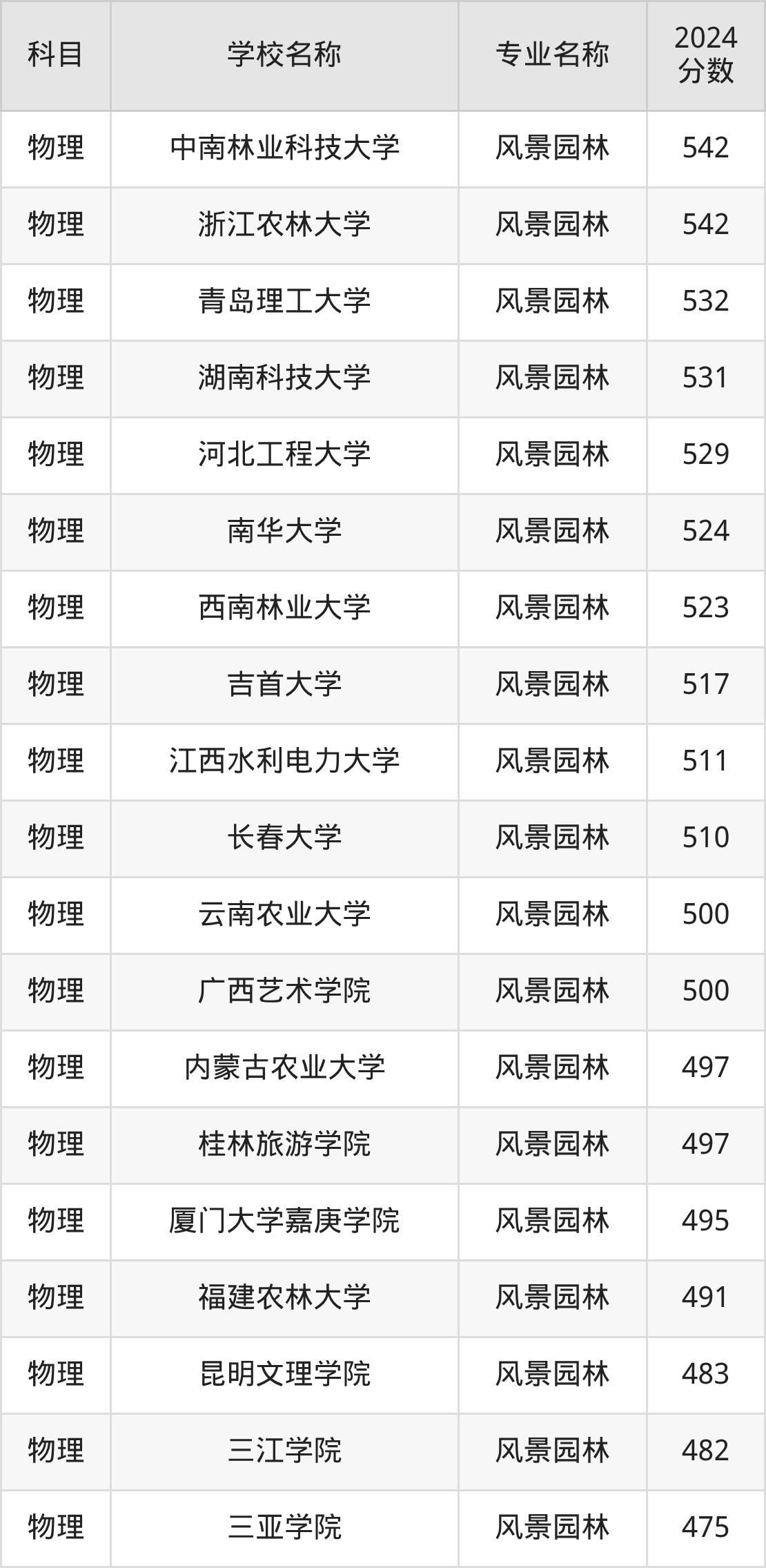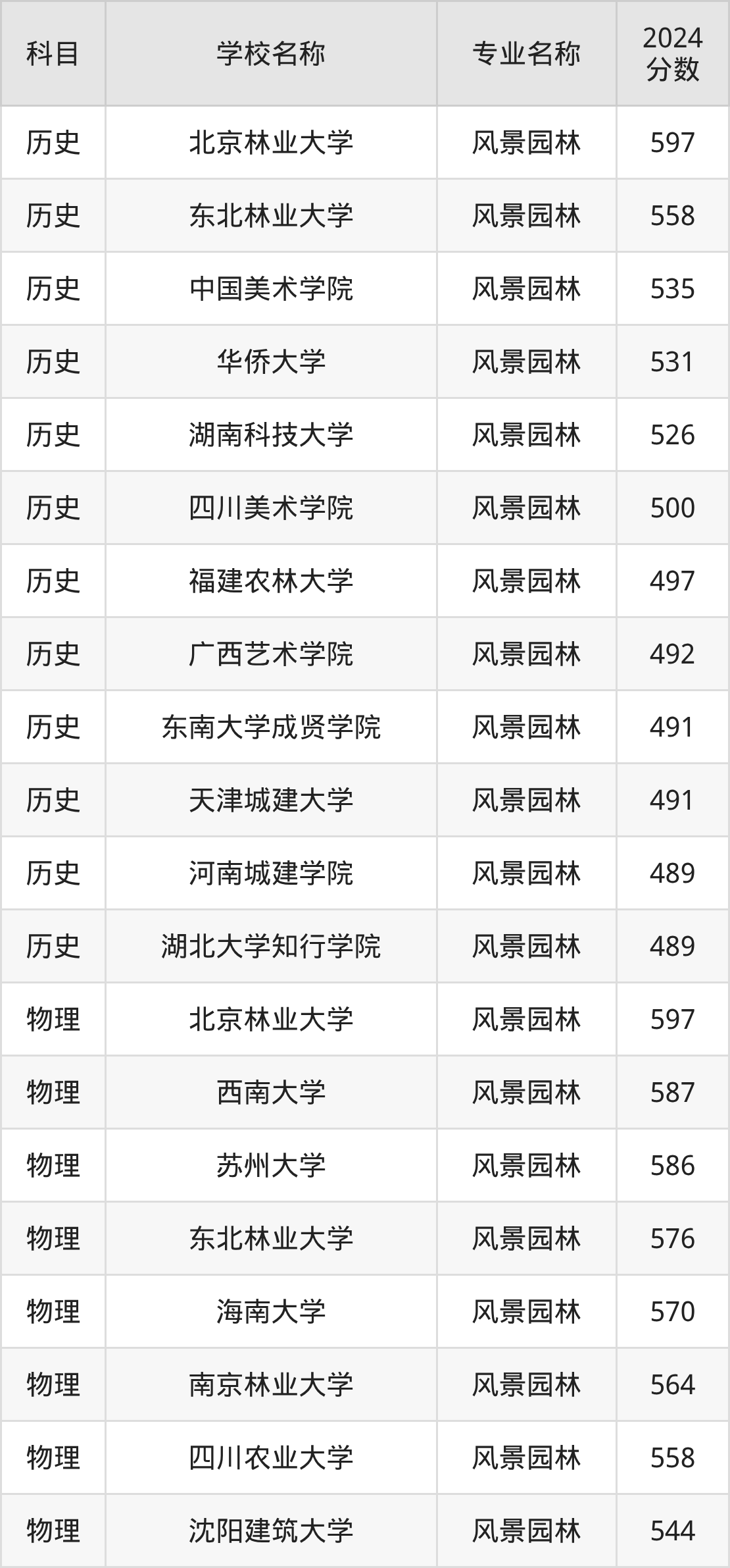 通过上文大家可以知晓,在广东省内招风景园林专业的院校数量较少,所以下文将为2026届高考生继续展示:省外大学的风景园林专业2024年在广东高考的录取情况,包含北京林业大学、东北林业大学、中国美术学院、华侨大学、湖南科技大学。