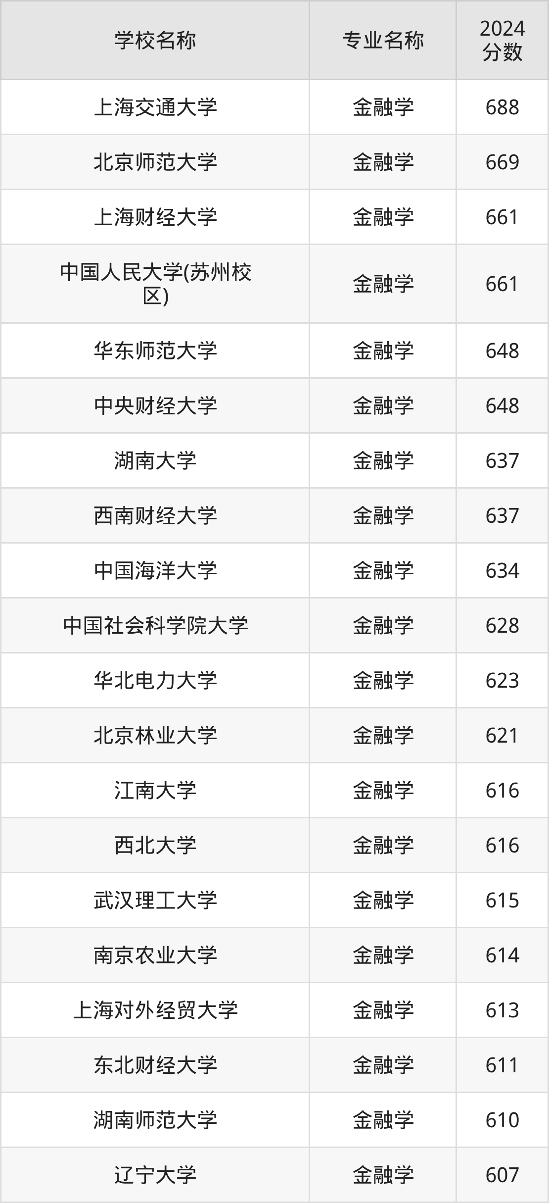 通过上文大家可以知晓,在天津市内招金融学专业的院校数量较少,所以下文将为2026届高考生继续展示:市外大学的金融学专业2024年在天津高考的录取情况,包含上海交通大学、北京师范大学、上海财经大学、中国人民大学(苏州校区)、华东师范大学。