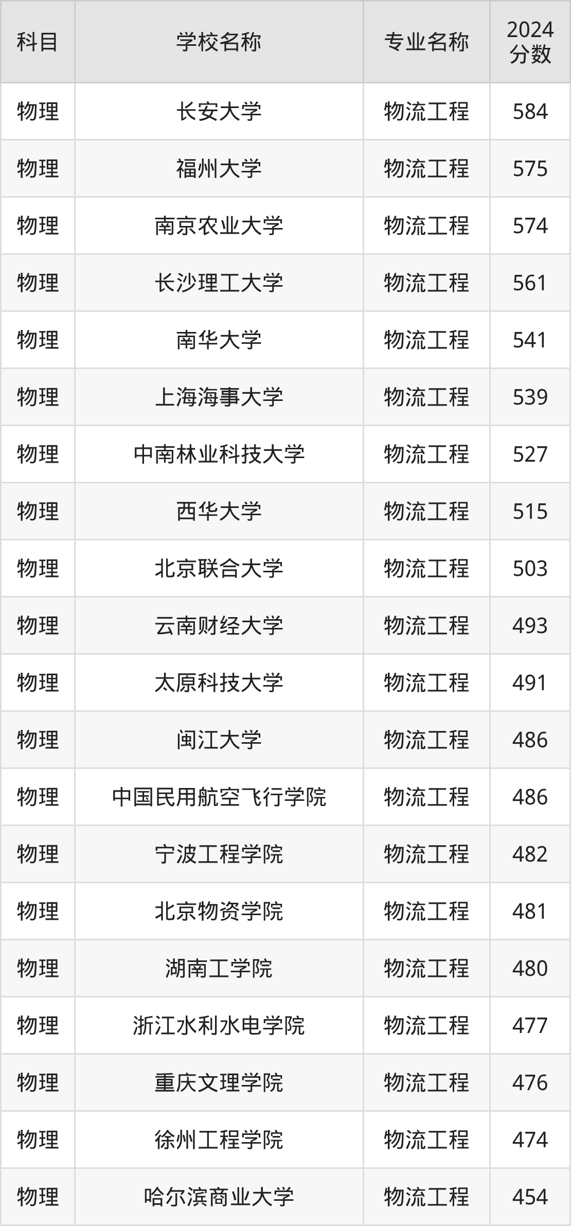 通过上文大家可以知晓,在广西壮族自治区内招物流工程专业的院校数量较少,所以下文将为2026届高考生继续展示:壮族自治区外大学的物流工程专业2024年在广西高考的录取情况,包含长安大学、福州大学、南京农业大学、长沙理工大学、南华大学。