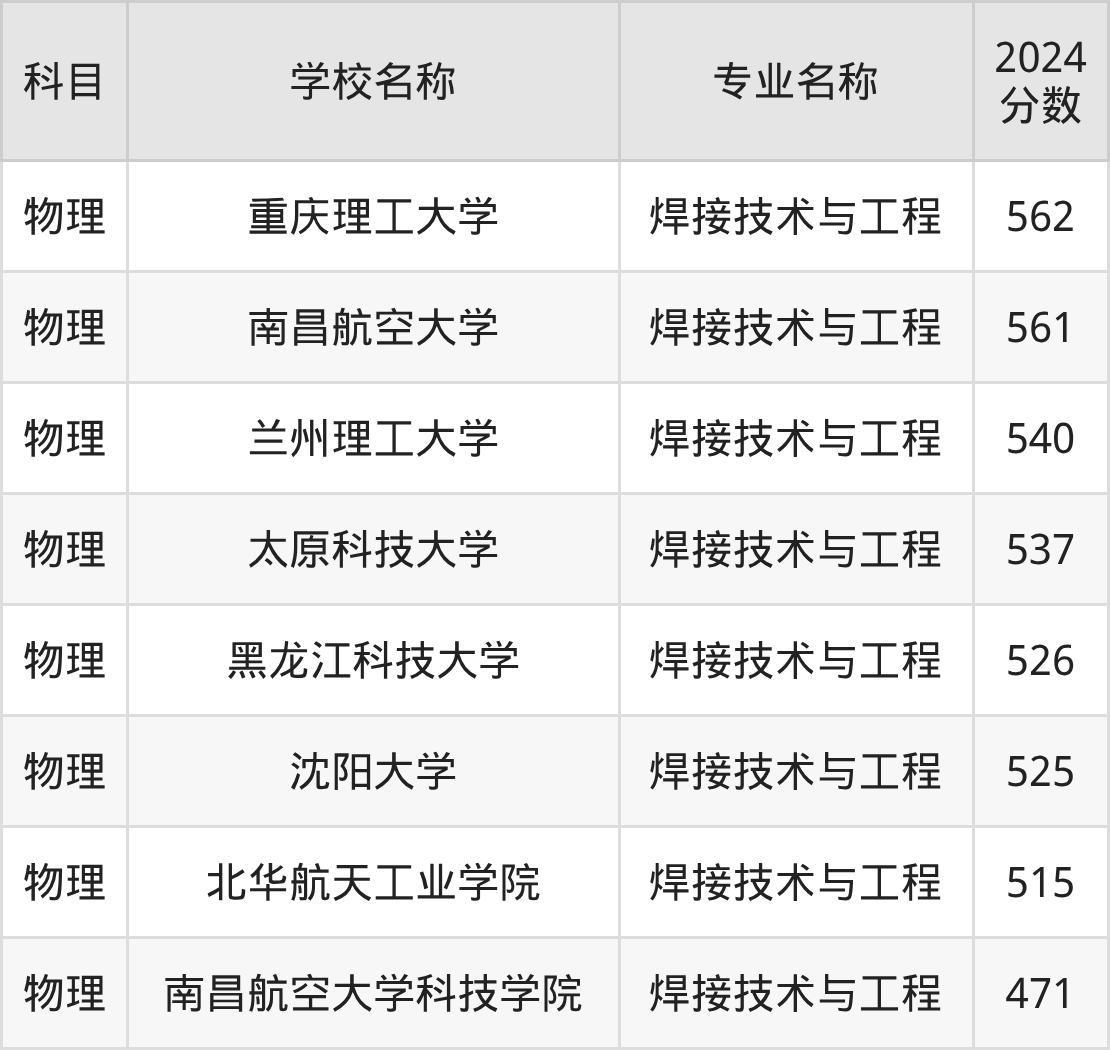 通过上文大家可以知晓,在江苏省内招焊接技术与工程专业的院校数量较少,所以下文将为2026届高考生继续展示:省外大学的焊接技术与工程专业2024年在江苏高考的录取情况,包含重庆理工大学、南昌航空大学、兰州理工大学、太原科技大学、黑龙江科技大学。