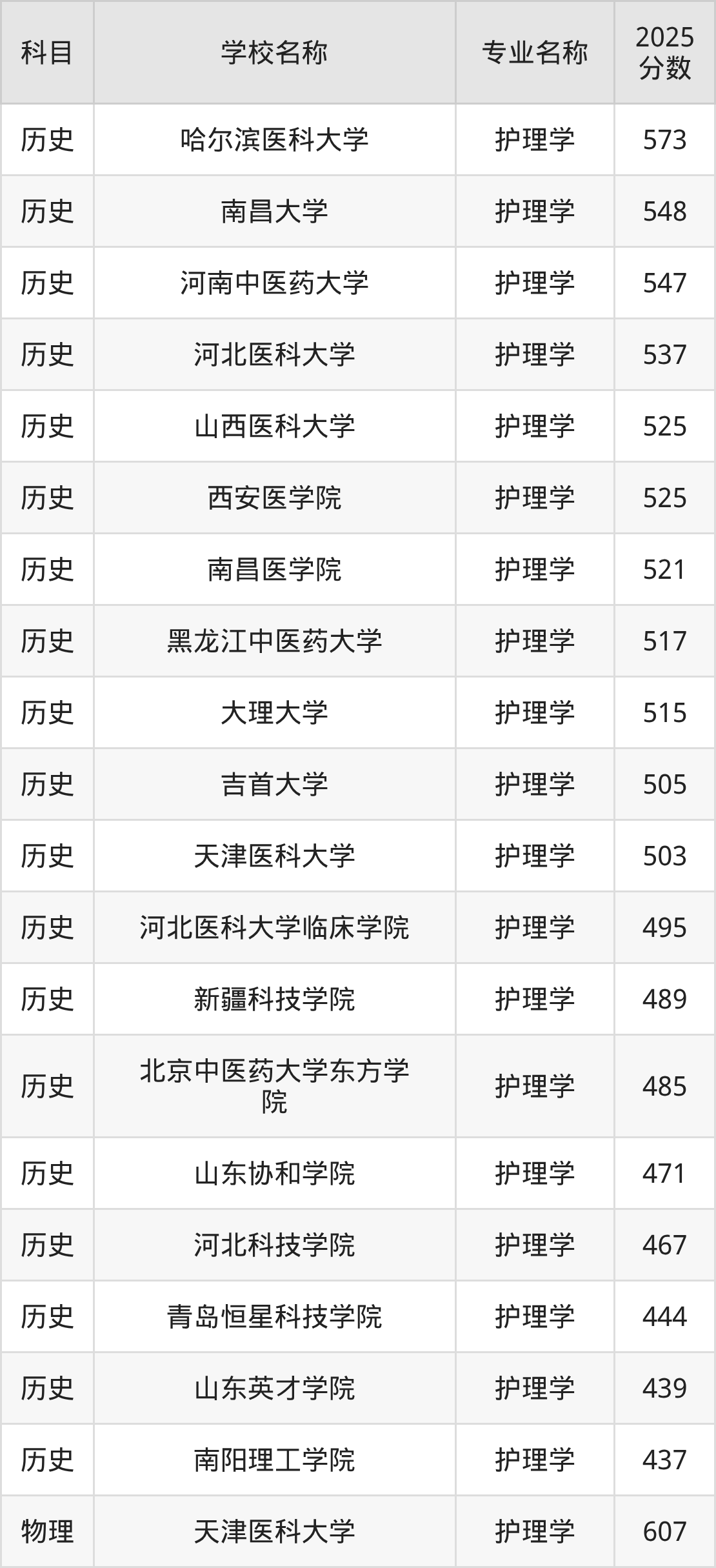 通过上文大家可以知晓,在辽宁省内招护理学专业的院校数量较少,所以下文将为2026届高考生继续展示:省外大学的护理学专业2025年在辽宁高考的录取情况,包含哈尔滨医科大学、南昌大学、河南中医药大学、河北医科大学、山西医科大学。