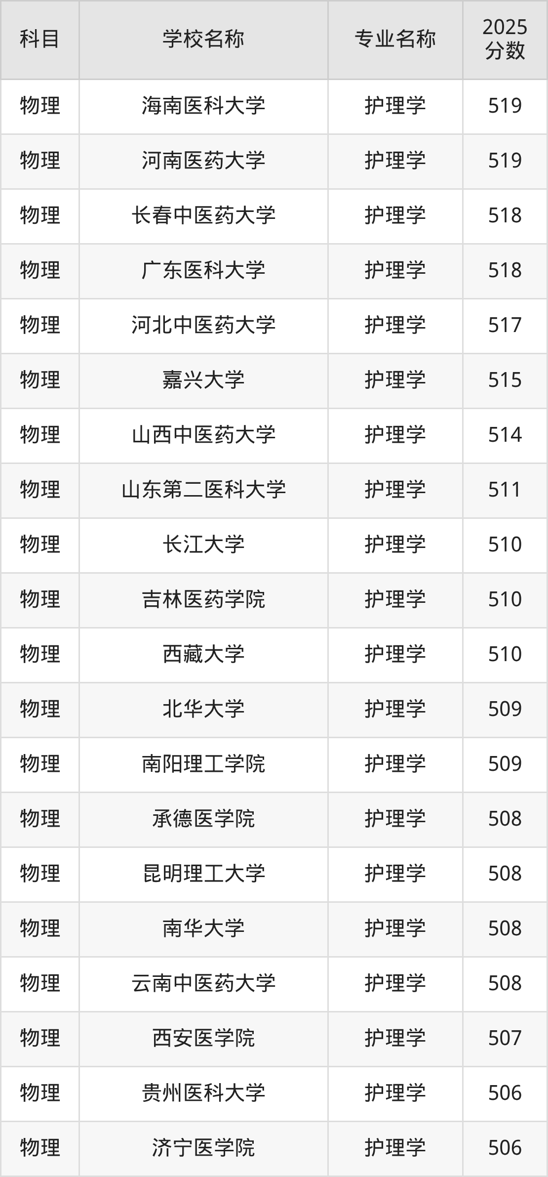 | 沈阳医学院 | 护理学 | 515 |