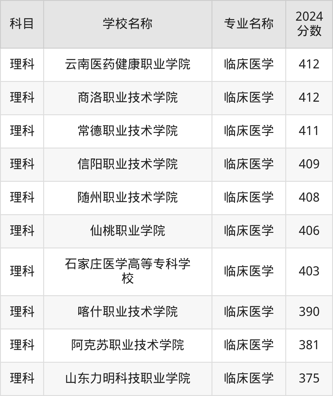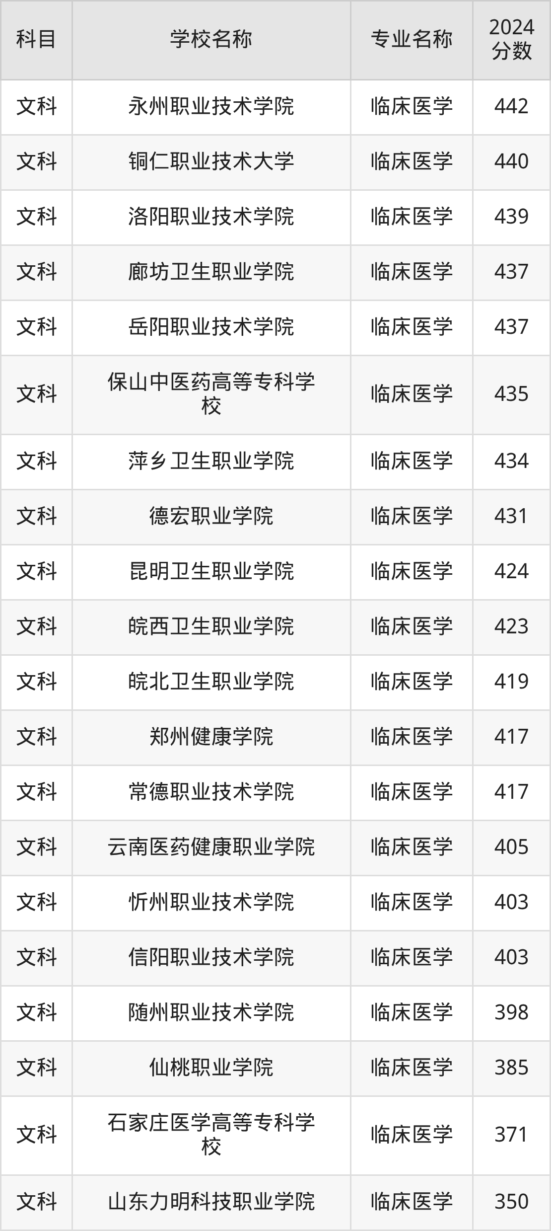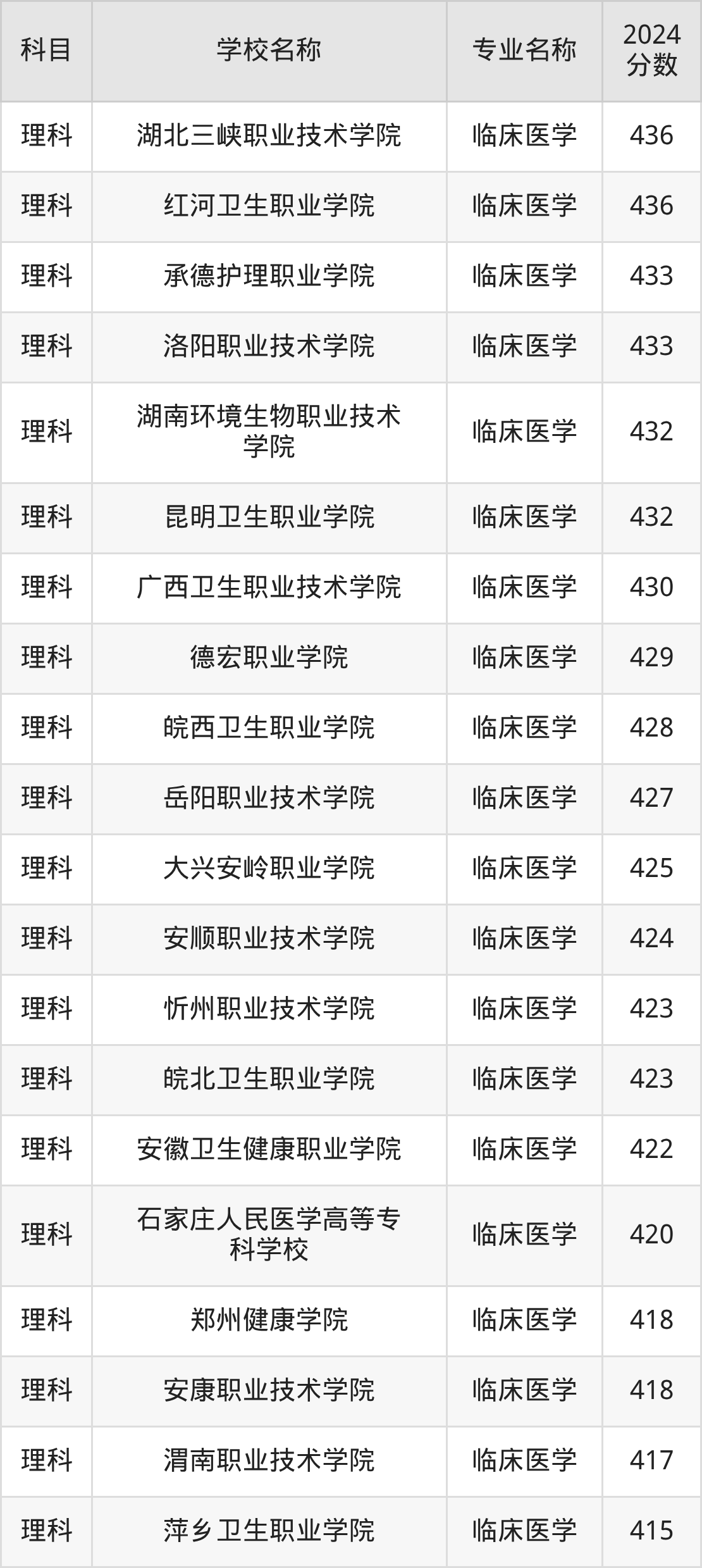 | 雅安职业技术学院(医 学类) | 临床医学 | 458 |