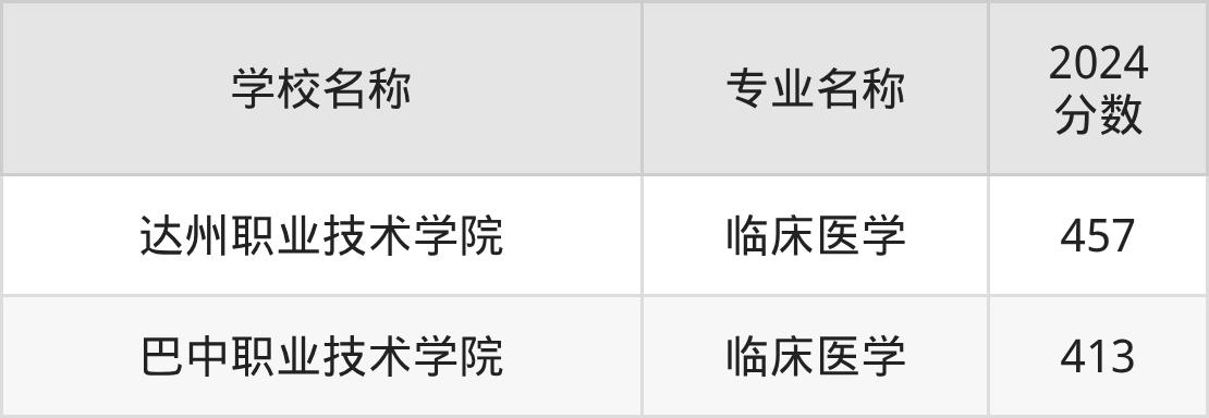 | 巴中职业技术学院 | 临床医学 | 409 |