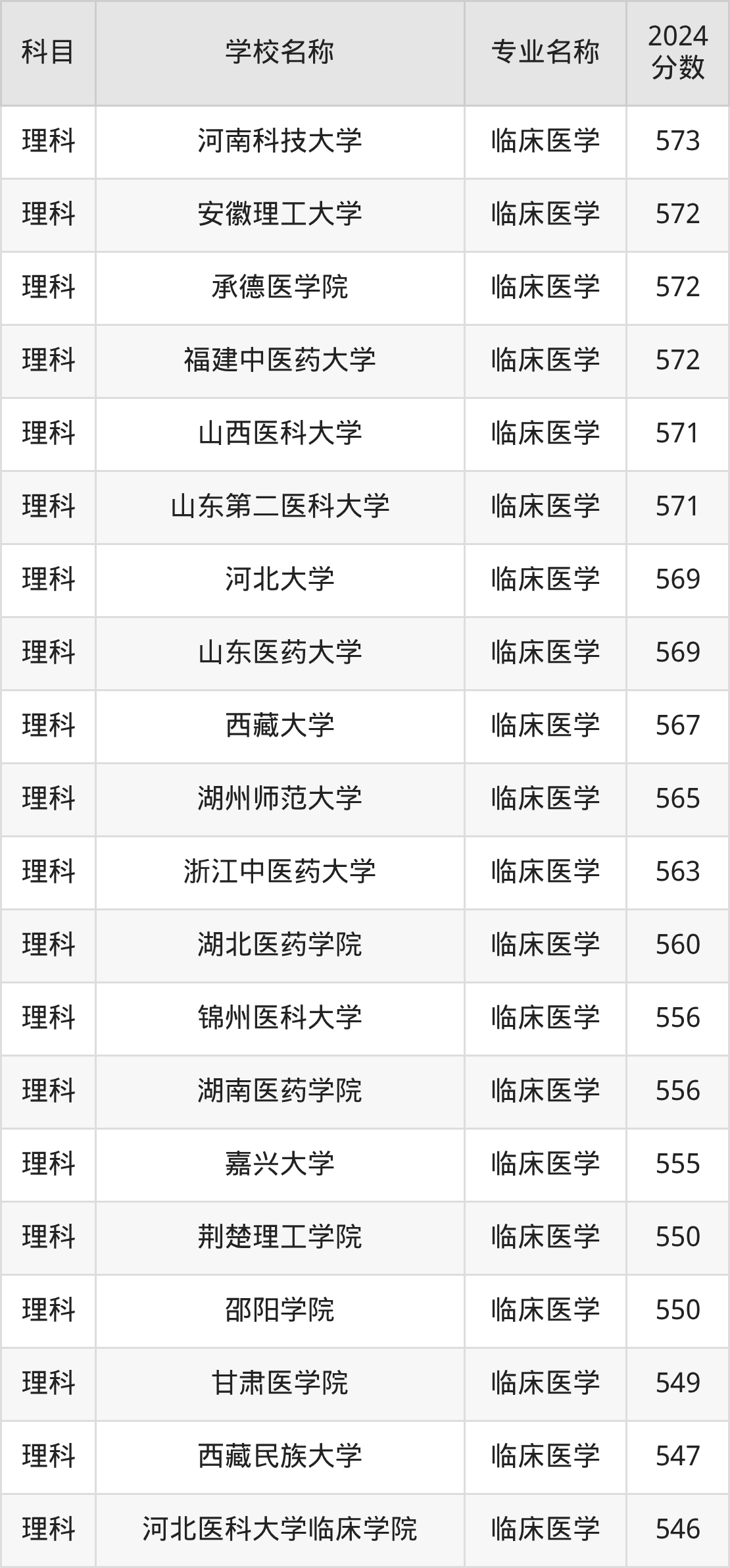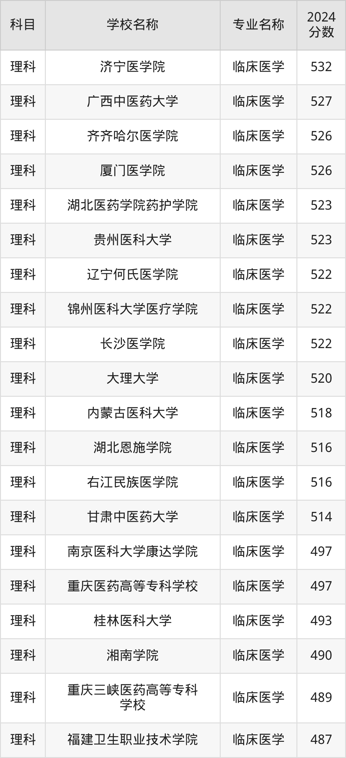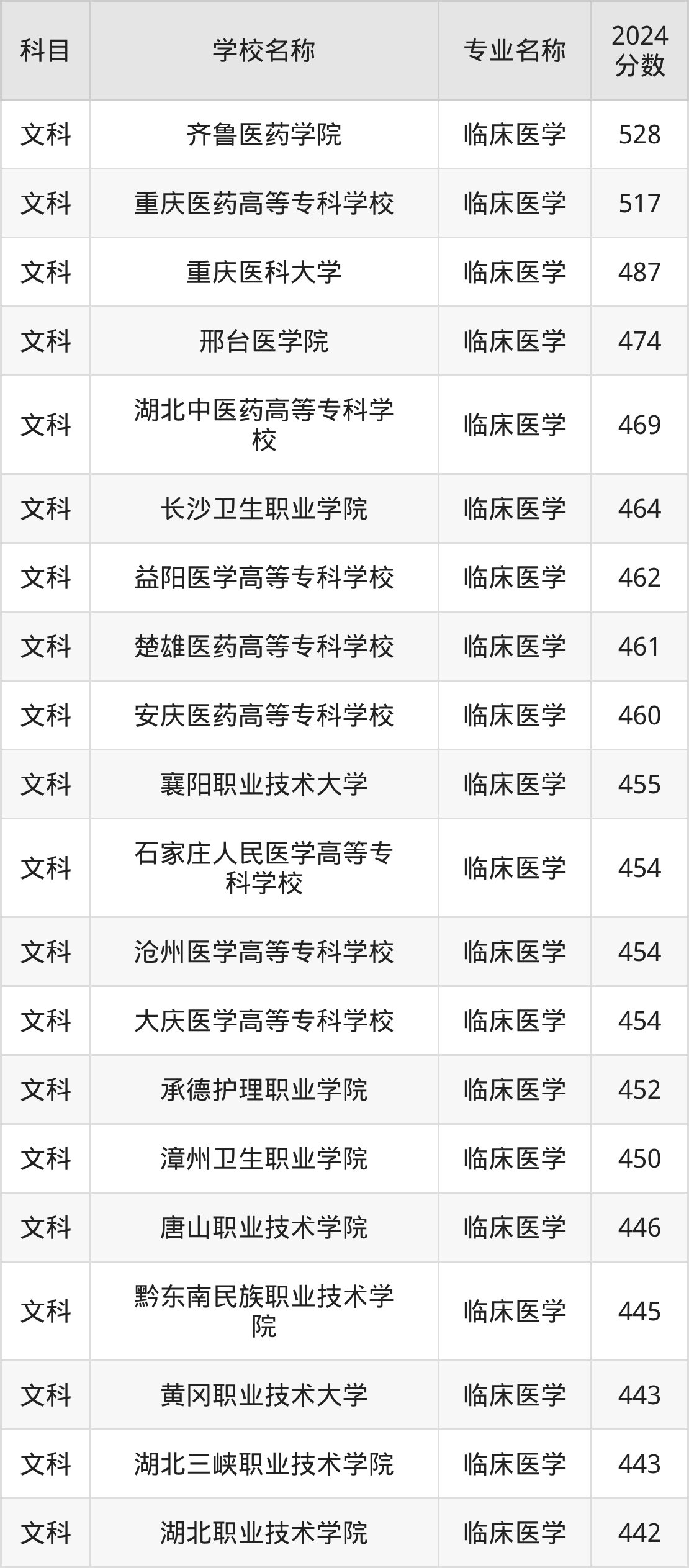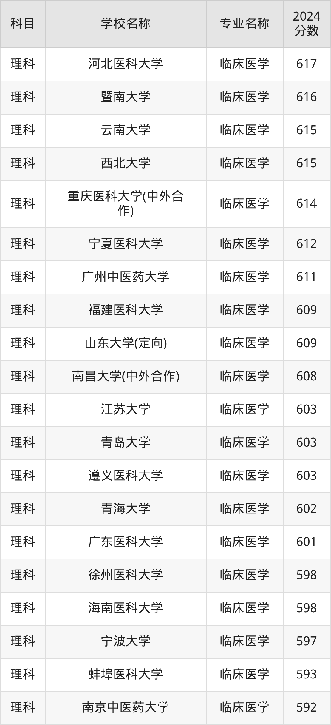 通过上文大家可以知晓,在四川省内招临床医学专业的院校数量较少,所以下文将为2026届高考生继续展示:省外大学的临床医学专业2024年在四川高考的录取情况,包含齐鲁医药学院、重庆医药高等专科学校、重庆医科大学、邢台医学院、湖北中医药高等专科学校。