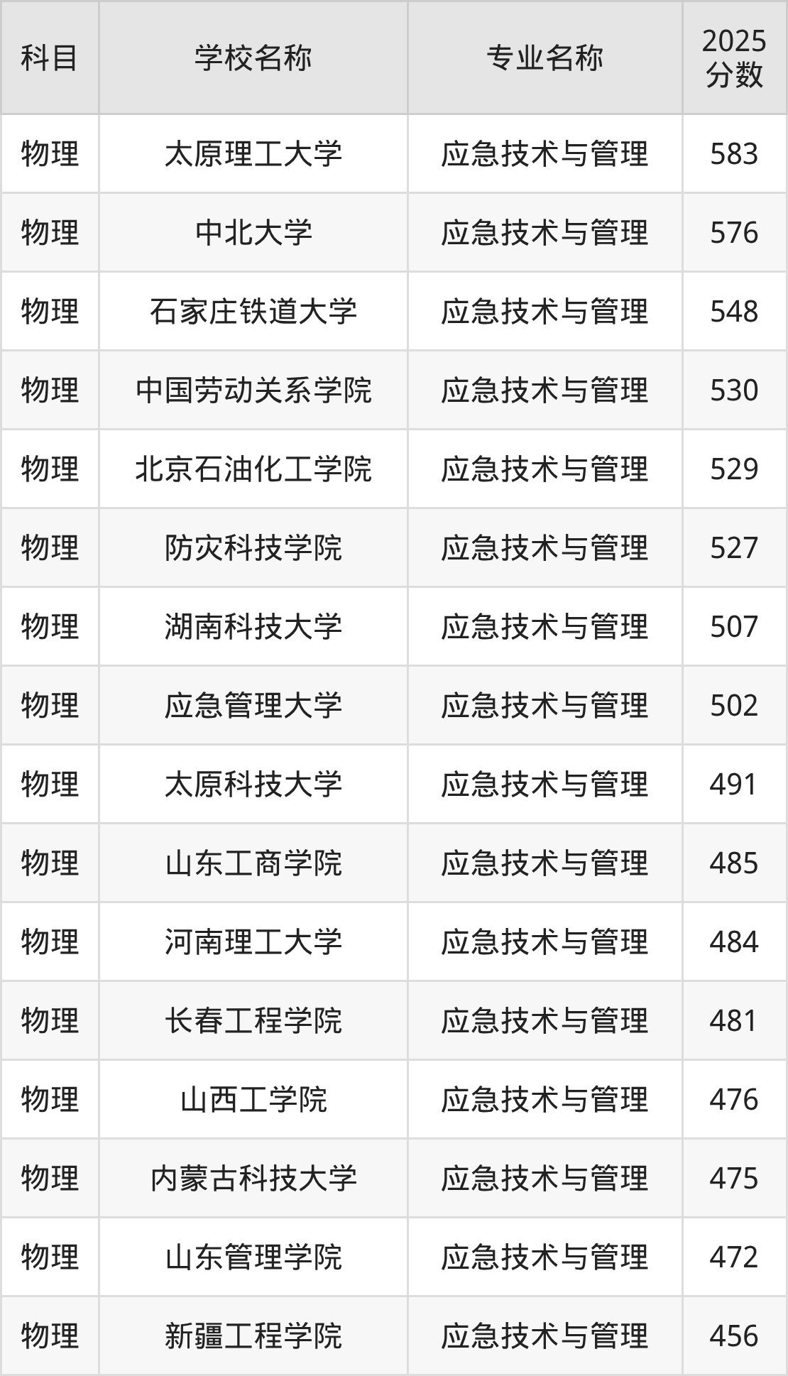 通过上文大家可以知晓,在辽宁省内招应急技术与管理专业的院校数量较少,所以下文将为2026届高考生继续展示:省外大学的应急技术与管理专业2025年在辽宁高考的录取情况,包含太原理工大学、中北大学、石家庄铁道大学、中国劳动关系学院、北京石油化工学院。