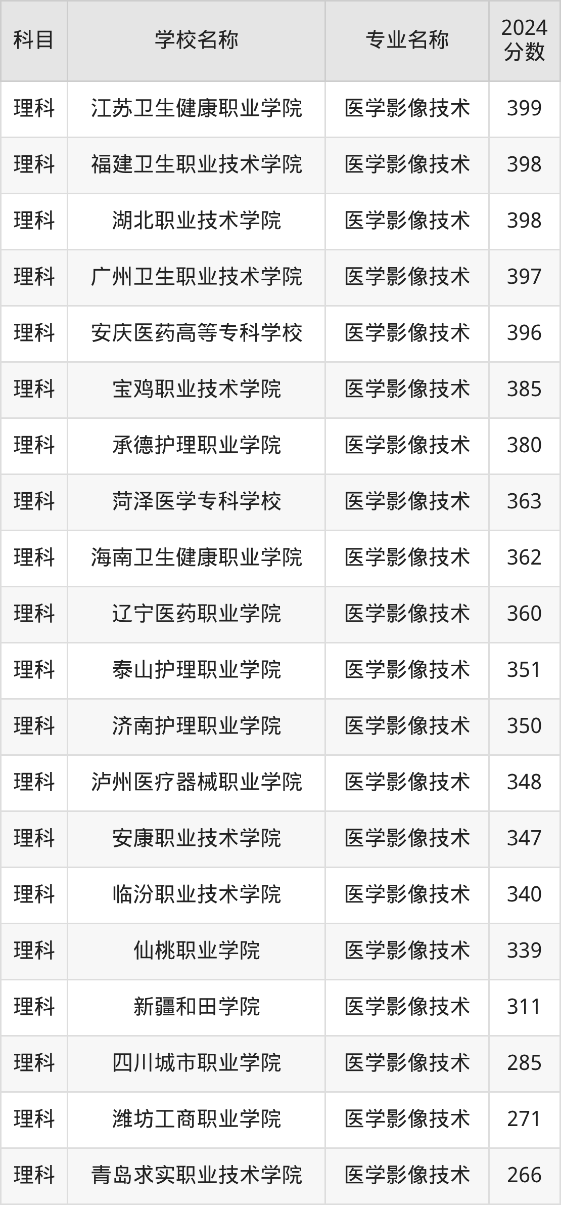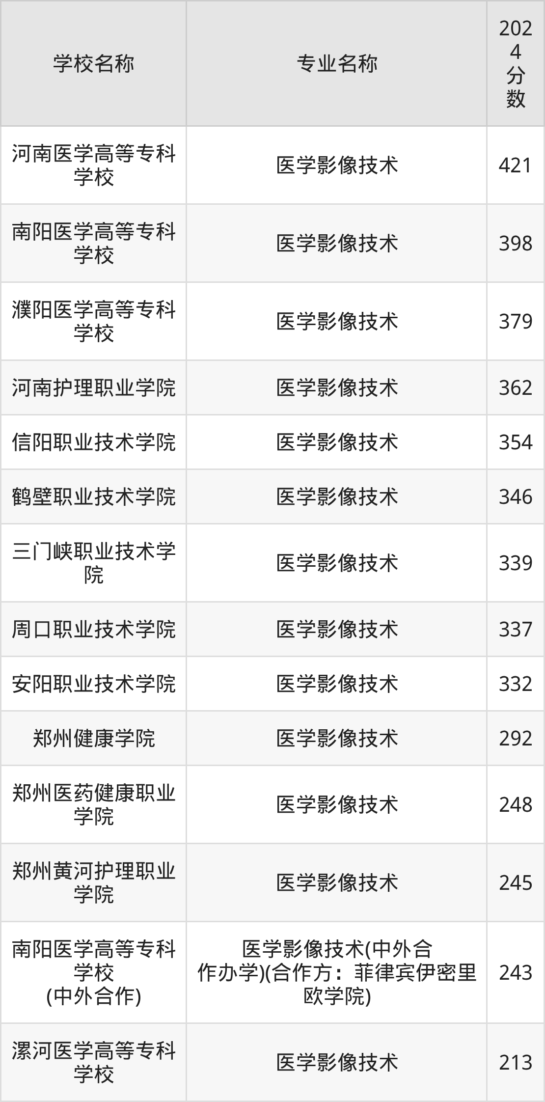 | 河南护理职业学院 | 医学影像技术 | 350 |