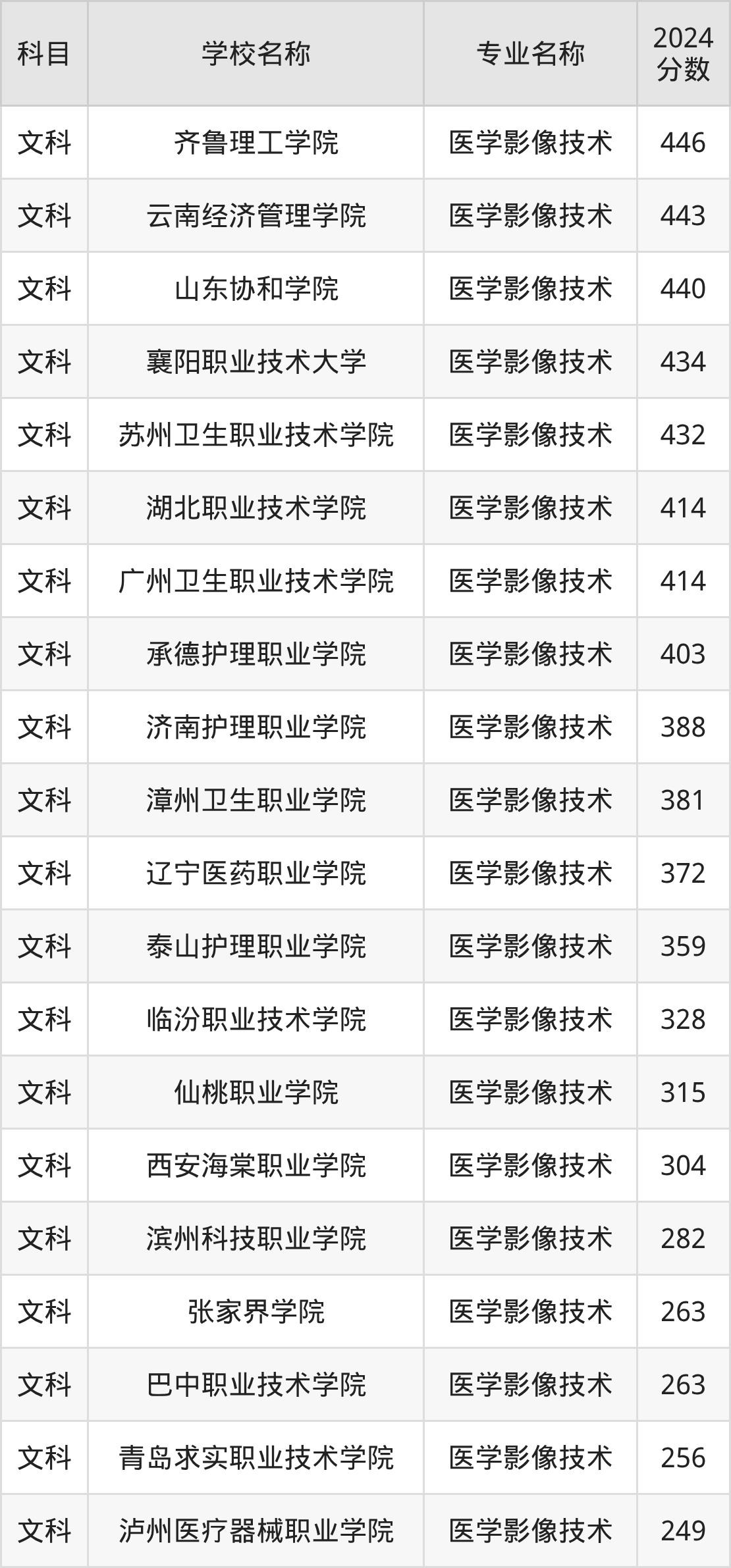 通过上文大家可以知晓,在河南省内招医学影像技术专业的院校数量较少,所以下文将为2026届高考生继续展示:省外大学的医学影像技术专业2024年在河南高考的录取情况,包含齐鲁理工学院、云南经济管理学院、山东协和学院、襄阳职业技术大学、苏州卫生职业技术学院。