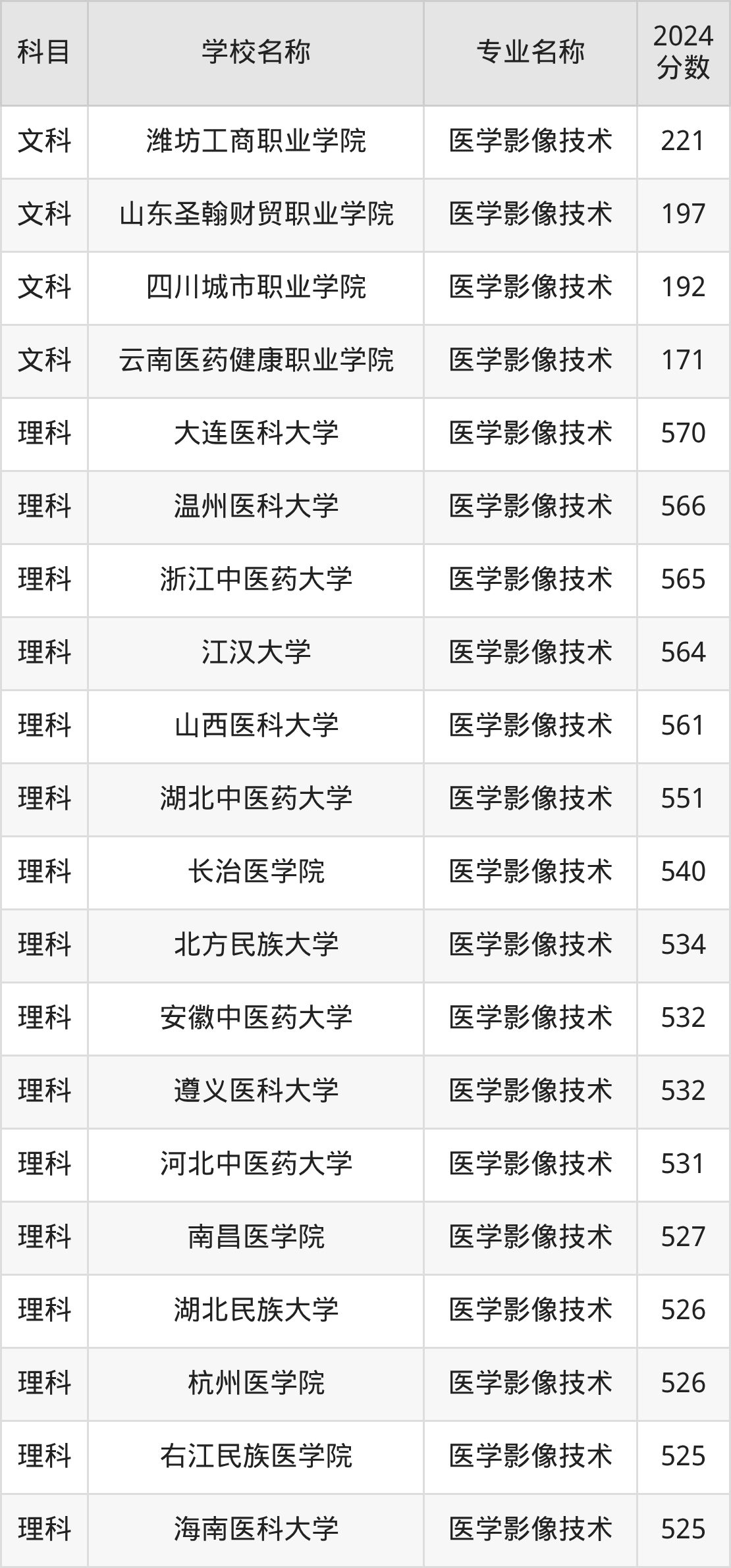 | 鹤壁职业技术学院 | 医学影像技术 | 322 |