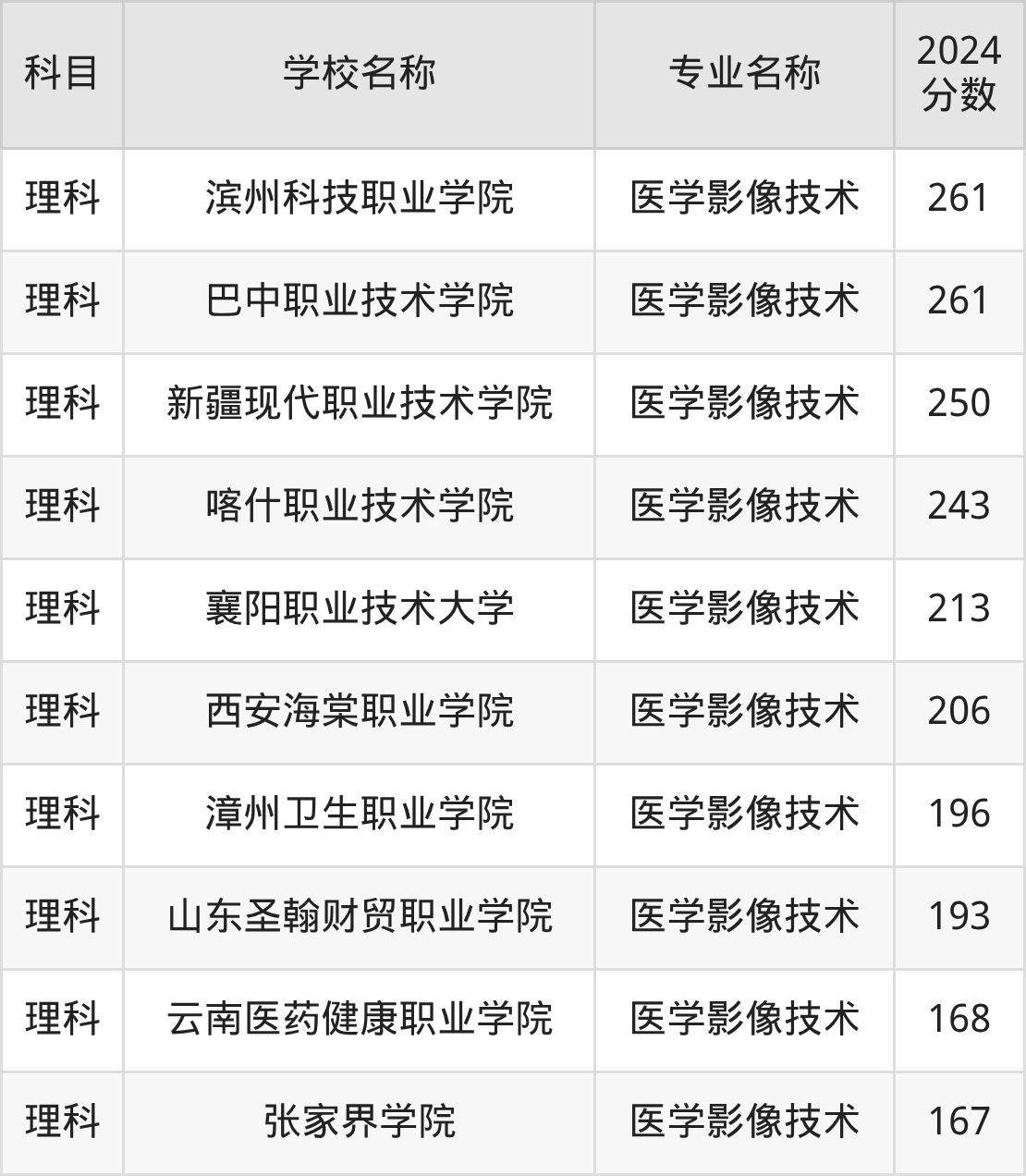 | 漯河医学高等专科学校 | 医学影像技术 | 191 |