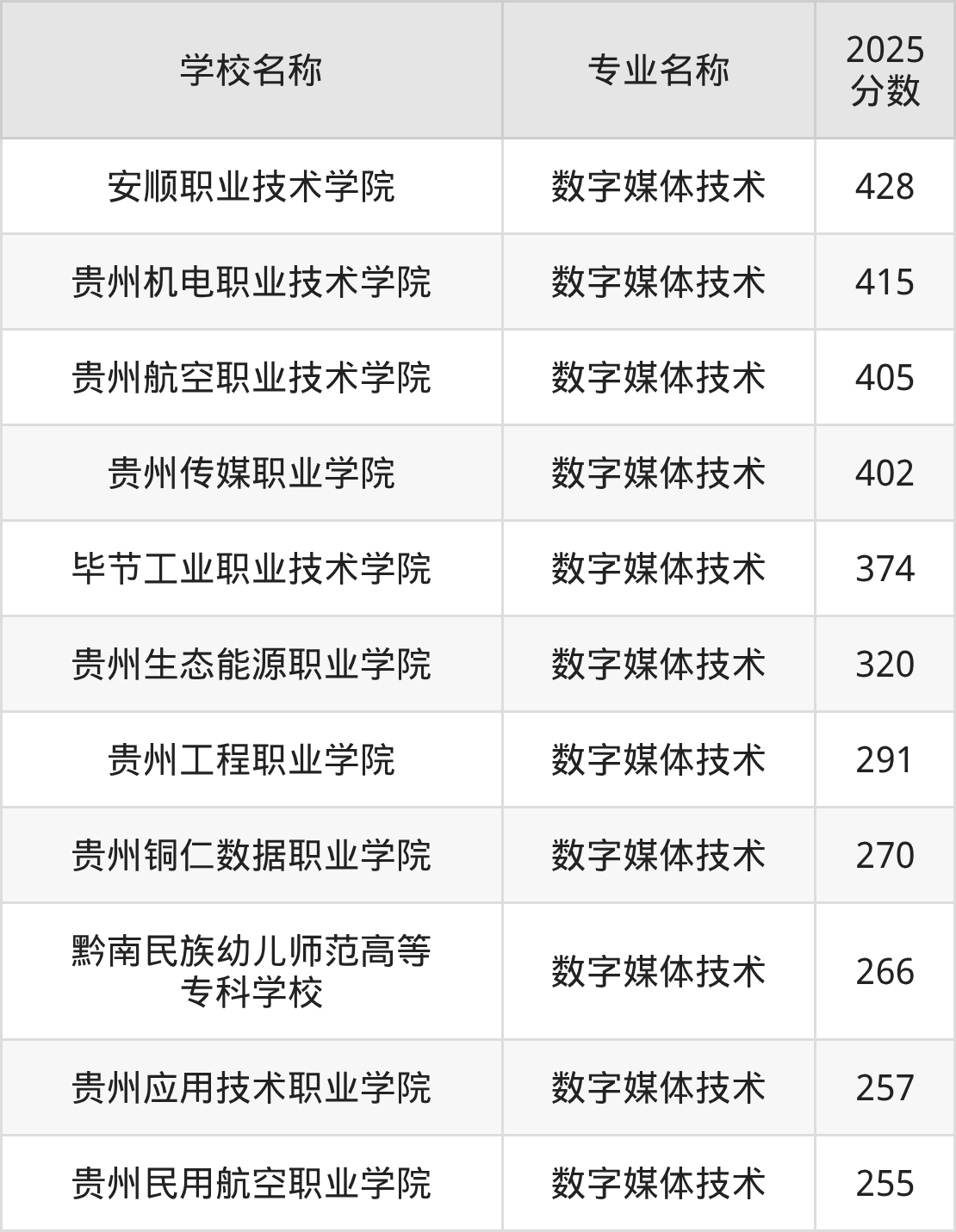 下文将为大家展示贵州省大学数字媒体技术专业2025年在贵州高考的最低录取分数线!