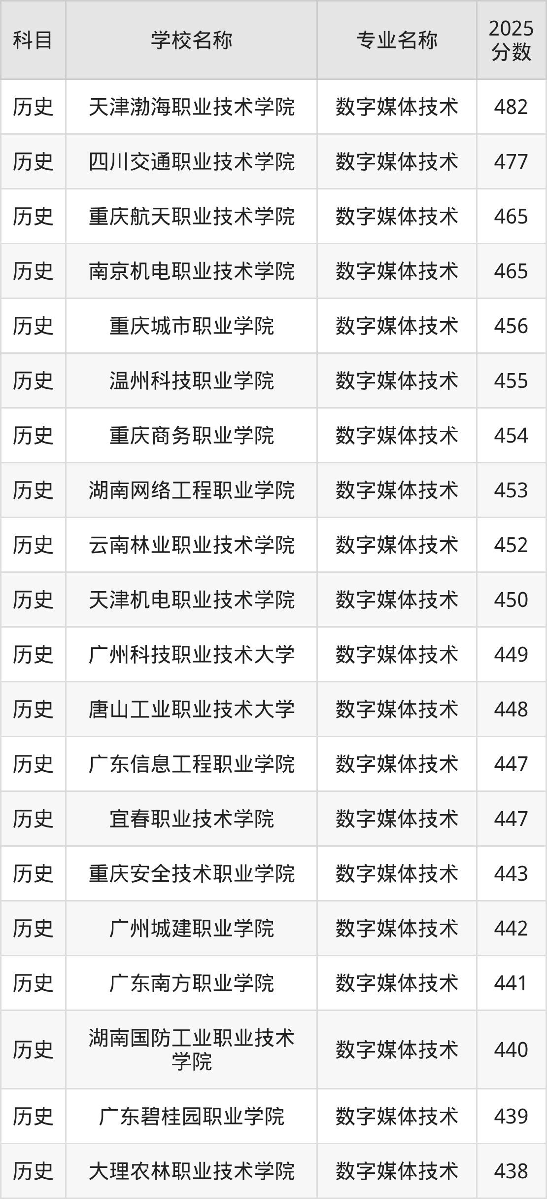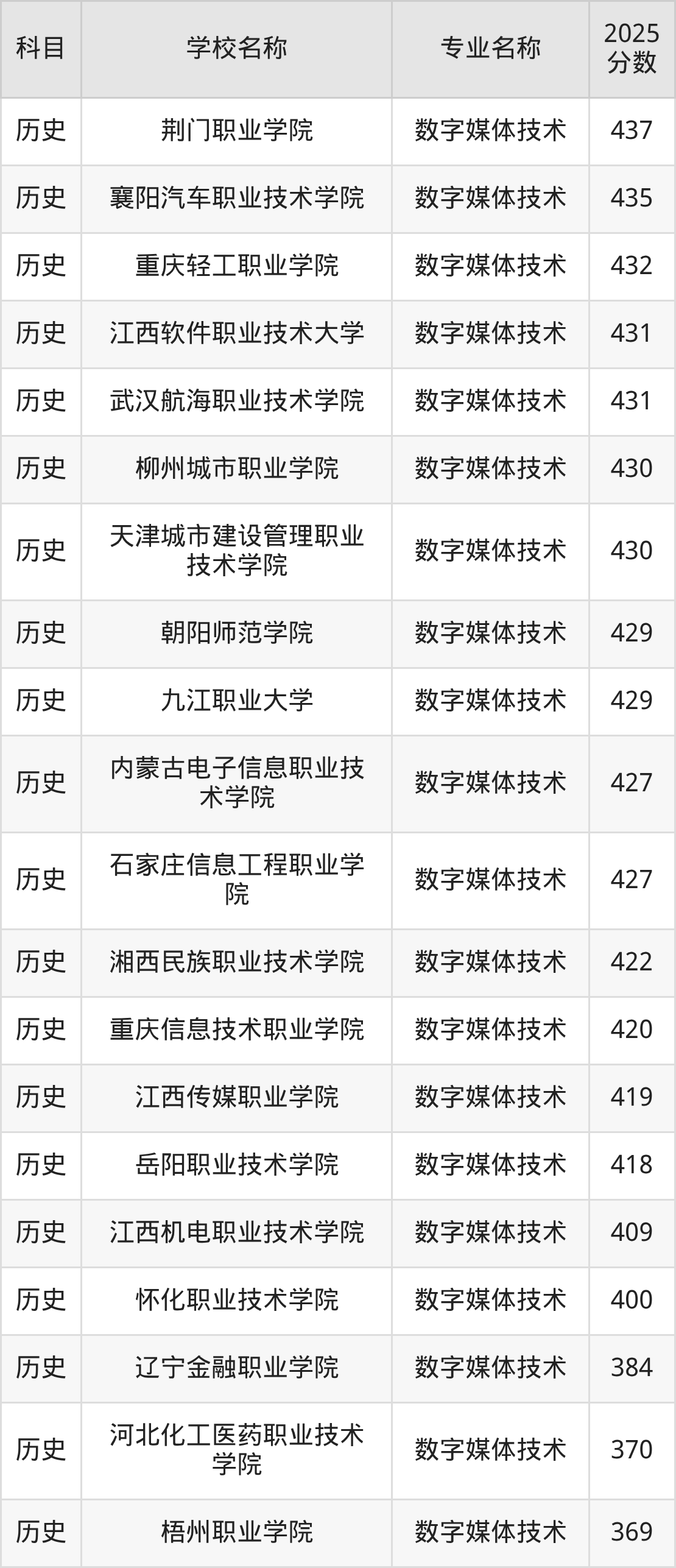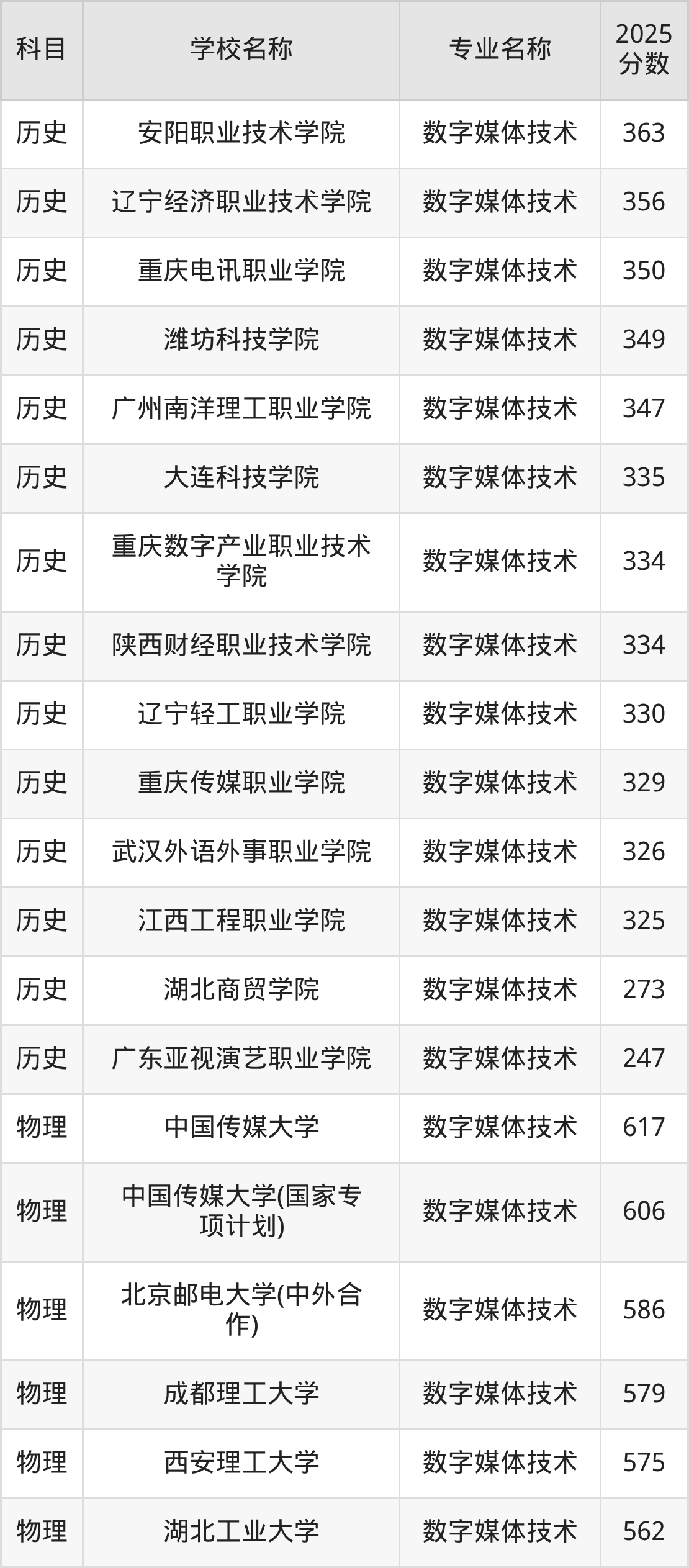 通过上文大家可以知晓,在贵州省内招数字媒体技术专业的院校数量较少,所以下文将为2026届高考生继续展示:省外大学的数字媒体技术专业2025年在贵州高考的录取情况,包含天津渤海职业技术学院、四川交通职业技术学院、重庆航天职业技术学院、南京机电职业技术学院、重庆城市职业学院。