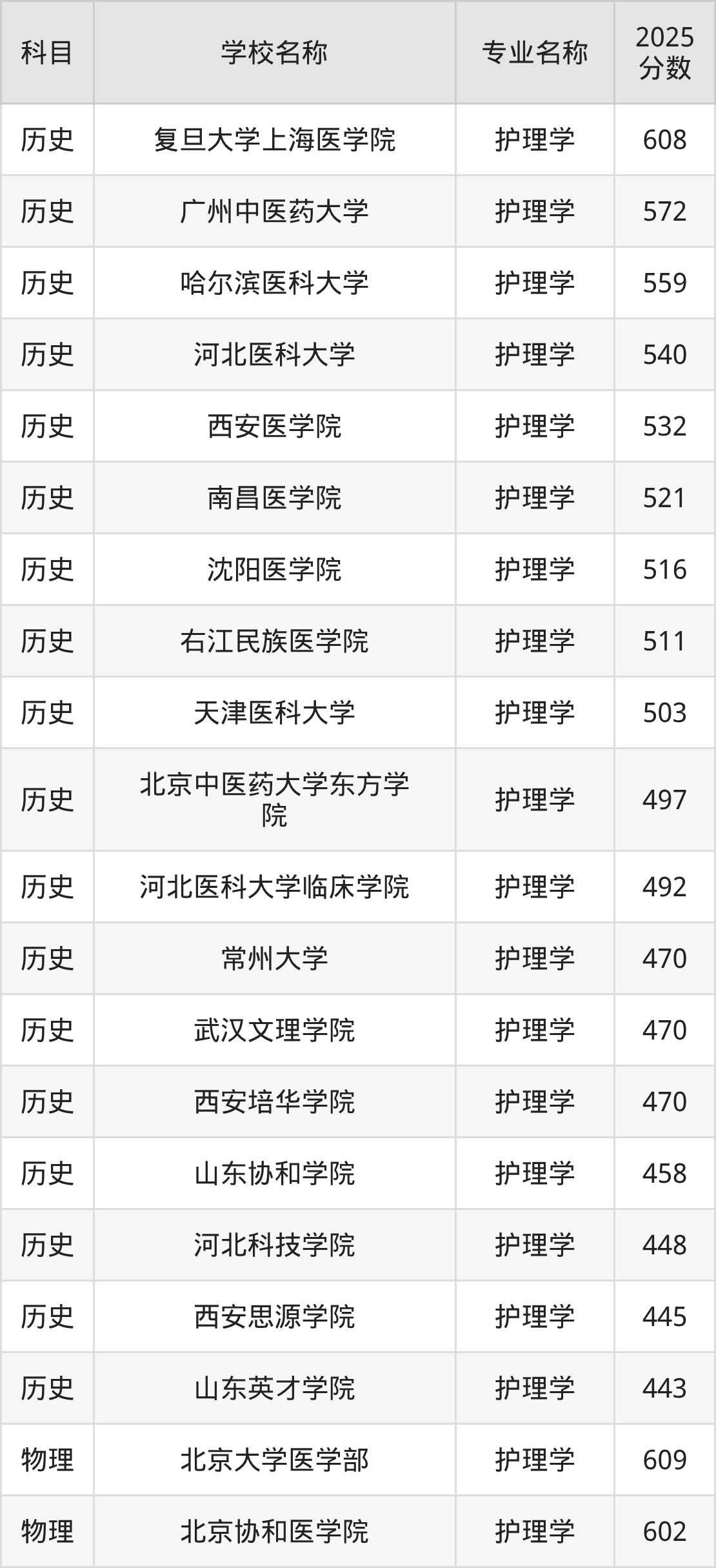 通过上文大家可以知晓,在山西省内招护理学专业的院校数量较少,所以下文将为2026届高考生继续展示:省外大学的护理学专业2025年在山西高考的录取情况,包含复旦大学上海医学院、广州中医药大学、哈尔滨医科大学、河北医科大学、西安医学院。