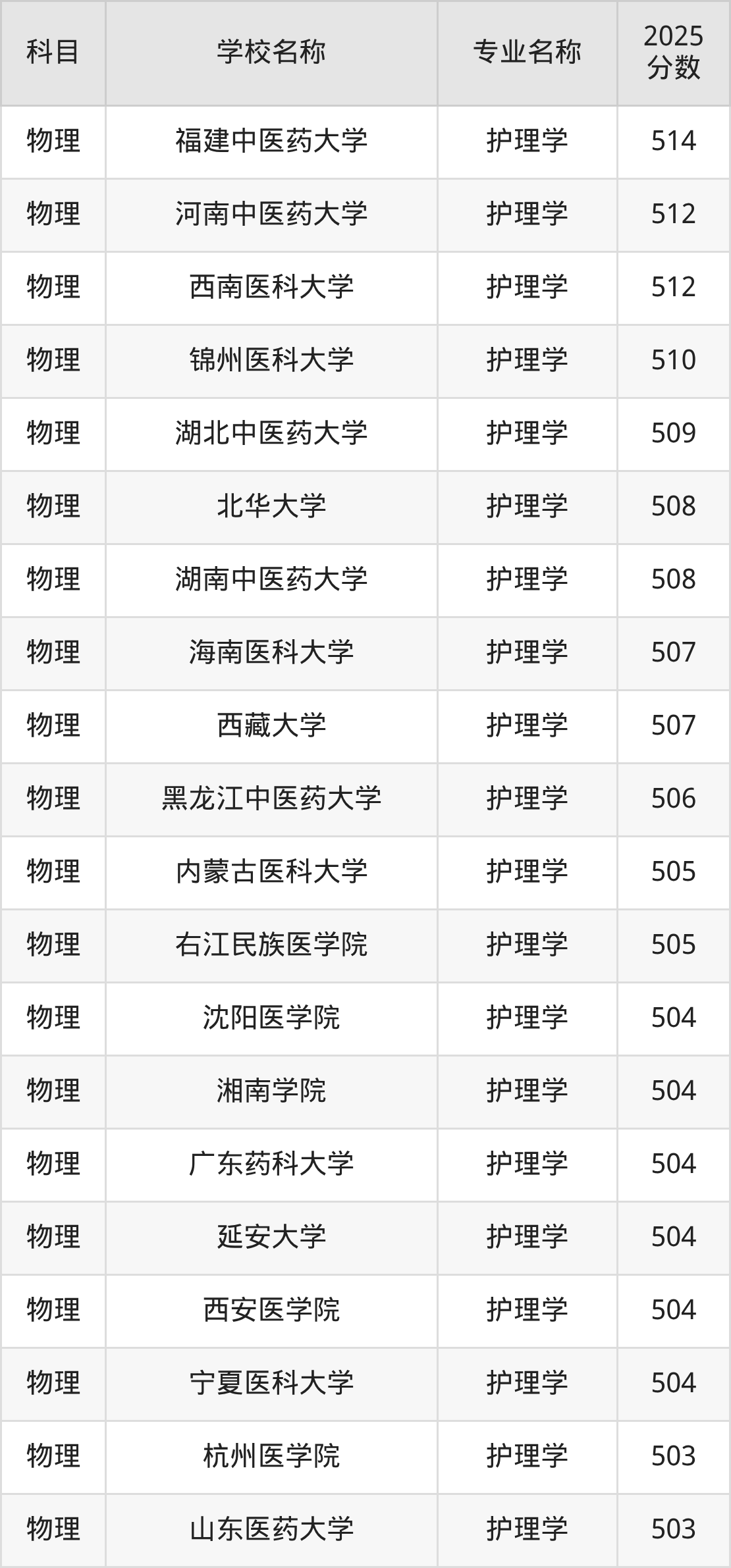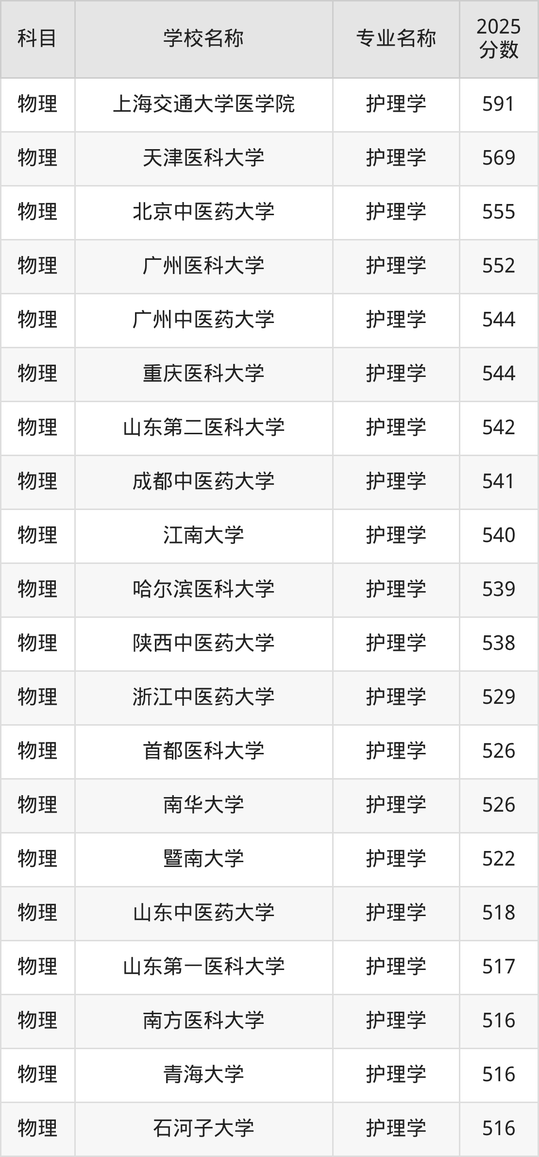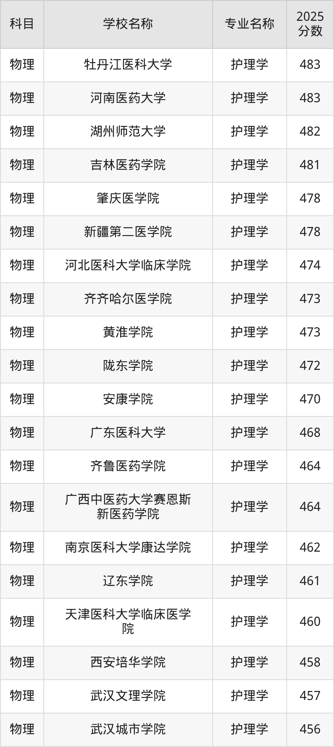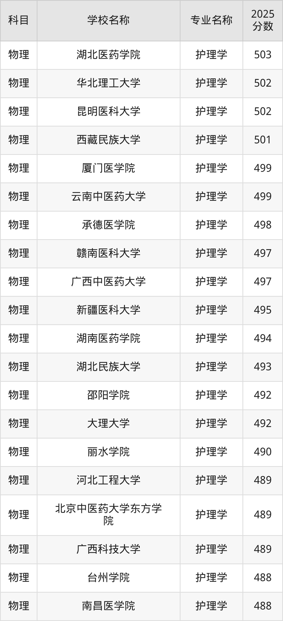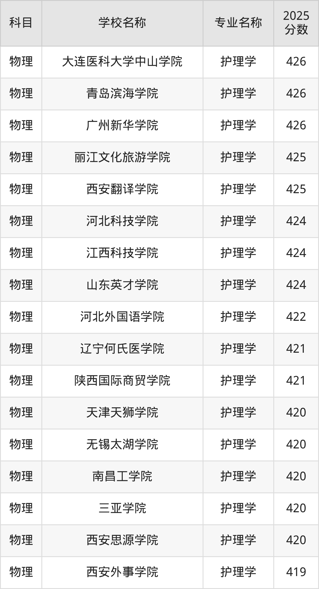 山西高考物理组:护理学专业的最低分是419分~509分