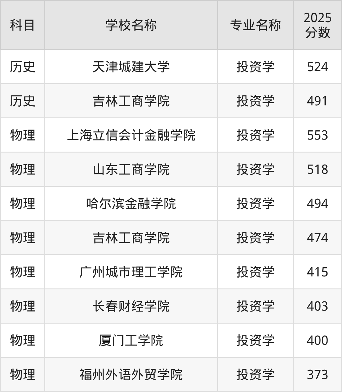 通过上文大家可以知晓,在辽宁省内招投资学专业的院校数量较少,所以下文将为2026届高考生继续展示:省外大学的投资学专业2025年在辽宁高考的录取情况,包含天津城建大学、吉林工商学院、上海立信会计金融学院、山东工商学院、哈尔滨金融学院。