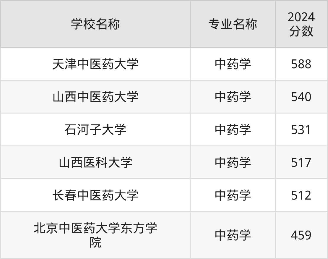 通过上文大家可以知晓,在北京市内招中药学专业的院校数量较少,所以下文将为2026届高考生继续展示:市外大学的中药学专业2024年在北京高考的录取情况,包含天津中医药大学、山西中医药大学、石河子大学、山西医科大学、长春中医药大学。