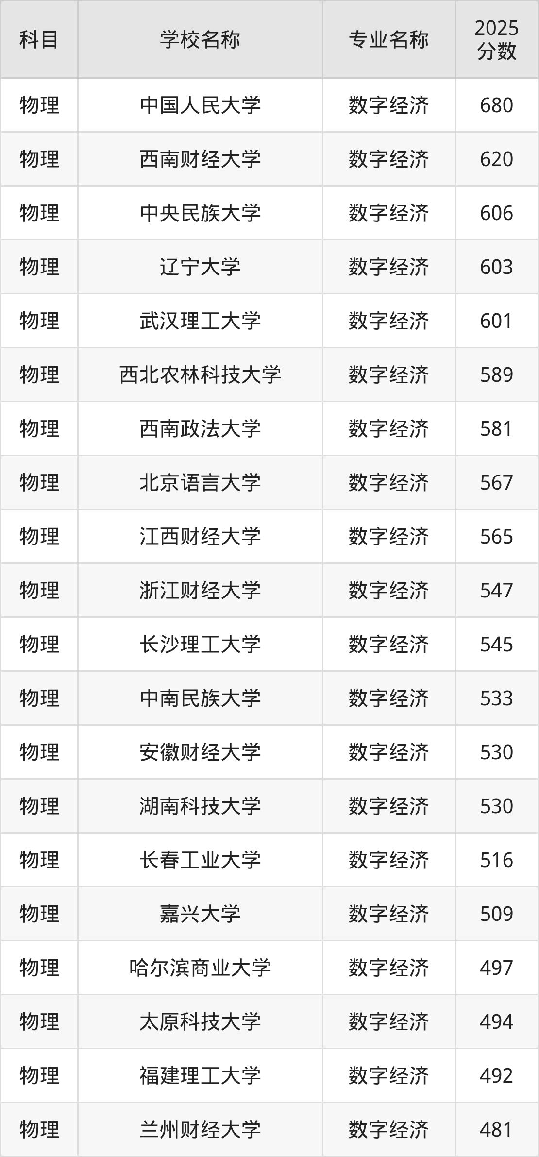 通过上文大家可以知晓,在内蒙古自治区内招数字经济专业的院校数量较少,所以下文将为2026届高考生继续展示:自治区外大学的数字经济专业2025年在内蒙古高考的录取情况,包含中国人民大学、西南财经大学、中央民族大学、辽宁大学、武汉理工大学。