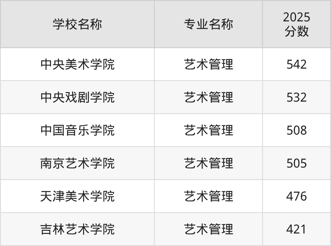 通过上文大家可以知晓,在上海市内招艺术管理专业的院校数量较少,所以下文将为2026届高考生继续展示:市外大学的艺术管理专业2025年在上海高考的录取情况,包含中央美术学院、中央戏剧学院、中国音乐学院、南京艺术学院、天津美术学院。