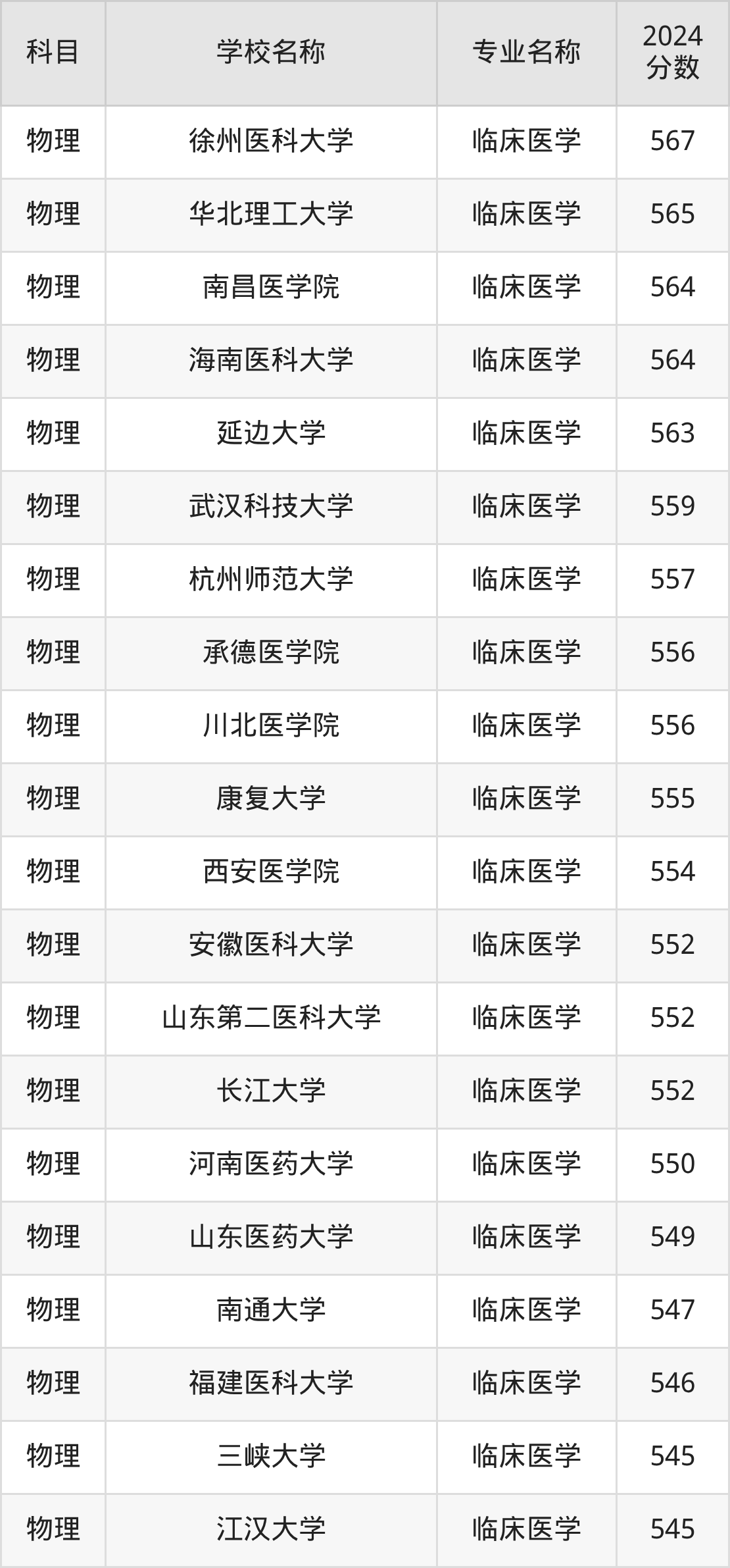 通过上文大家可以知晓,在湖南省内招临床医学专业的院校数量较少,所以下文将为2026届高考生继续展示:省外大学的临床医学专业2024年在湖南高考的录取情况,包含重庆医药高等专科学校、南阳医学高等专科学校、湖北中医药高等专科学校、长春医学高等专科学校、湖北三峡职业技术学院。