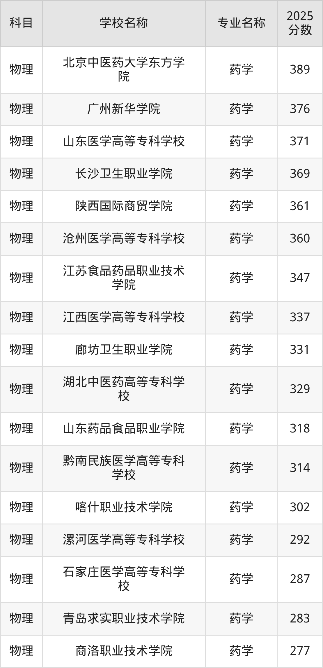 通过上文大家可以知晓,在吉林省内招药学专业的院校数量较少,所以下文将为2026届高考生继续展示:省外大学的药学专业2025年在吉林高考的录取情况,包含沧州医学高等专科学校、湖北中医药高等专科学校、廊坊卫生职业学院、山东药品食品职业学院、商洛职业技术学院。