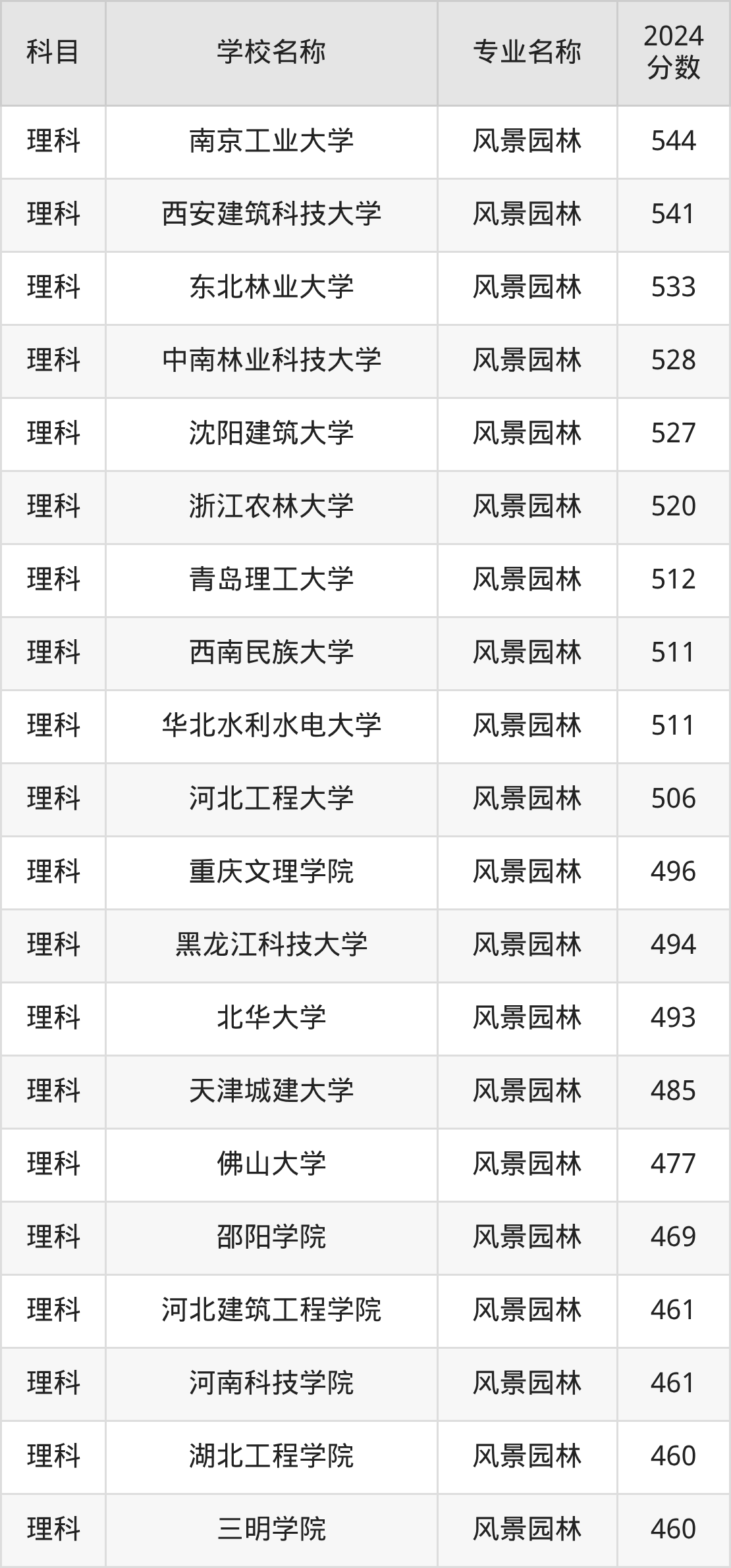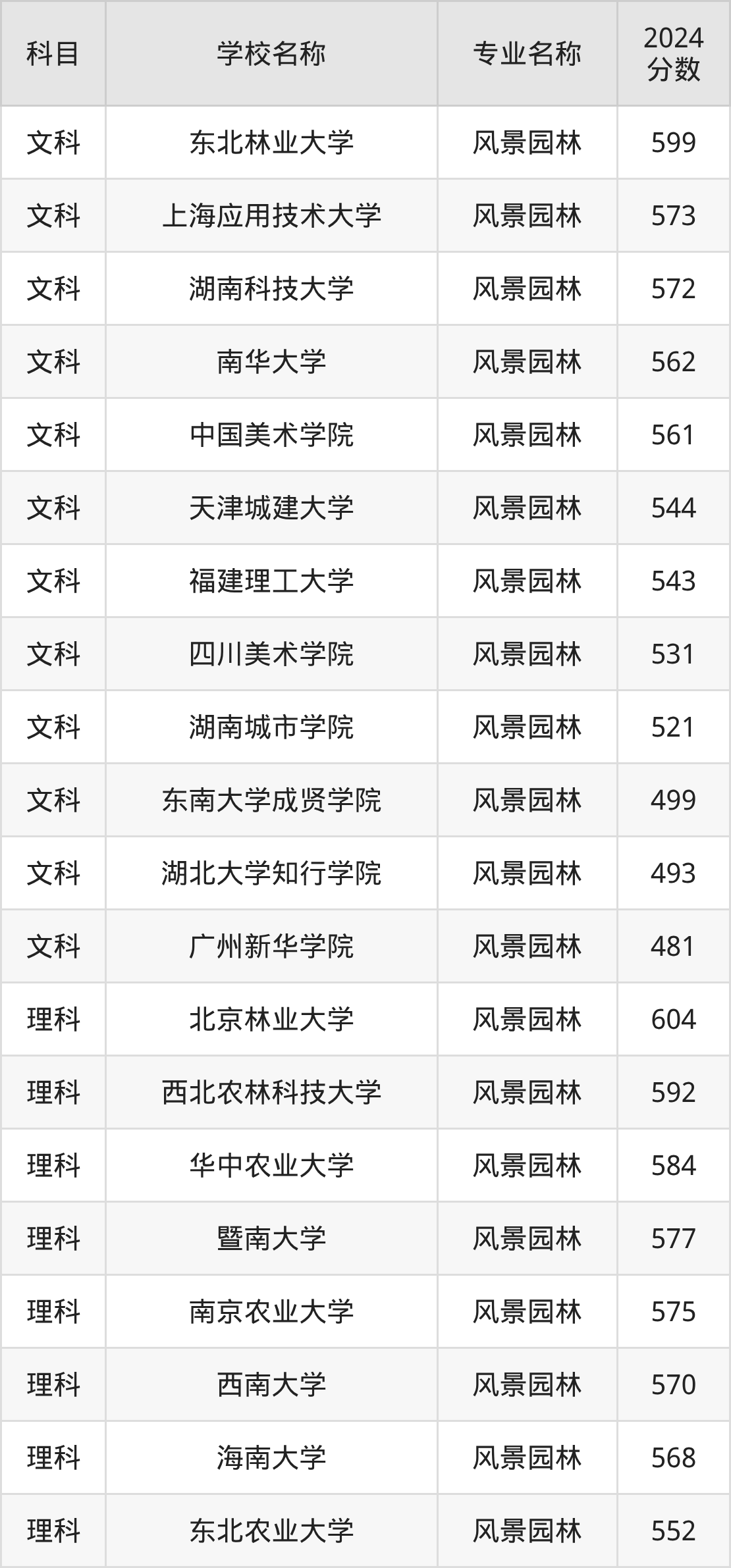 通过上文大家可以知晓,在云南省内招风景园林专业的院校数量较少,所以下文将为2026届高考生继续展示:省外大学的风景园林专业2024年在云南高考的录取情况,包含东北林业大学、上海应用技术大学、湖南科技大学、南华大学、中国美术学院。