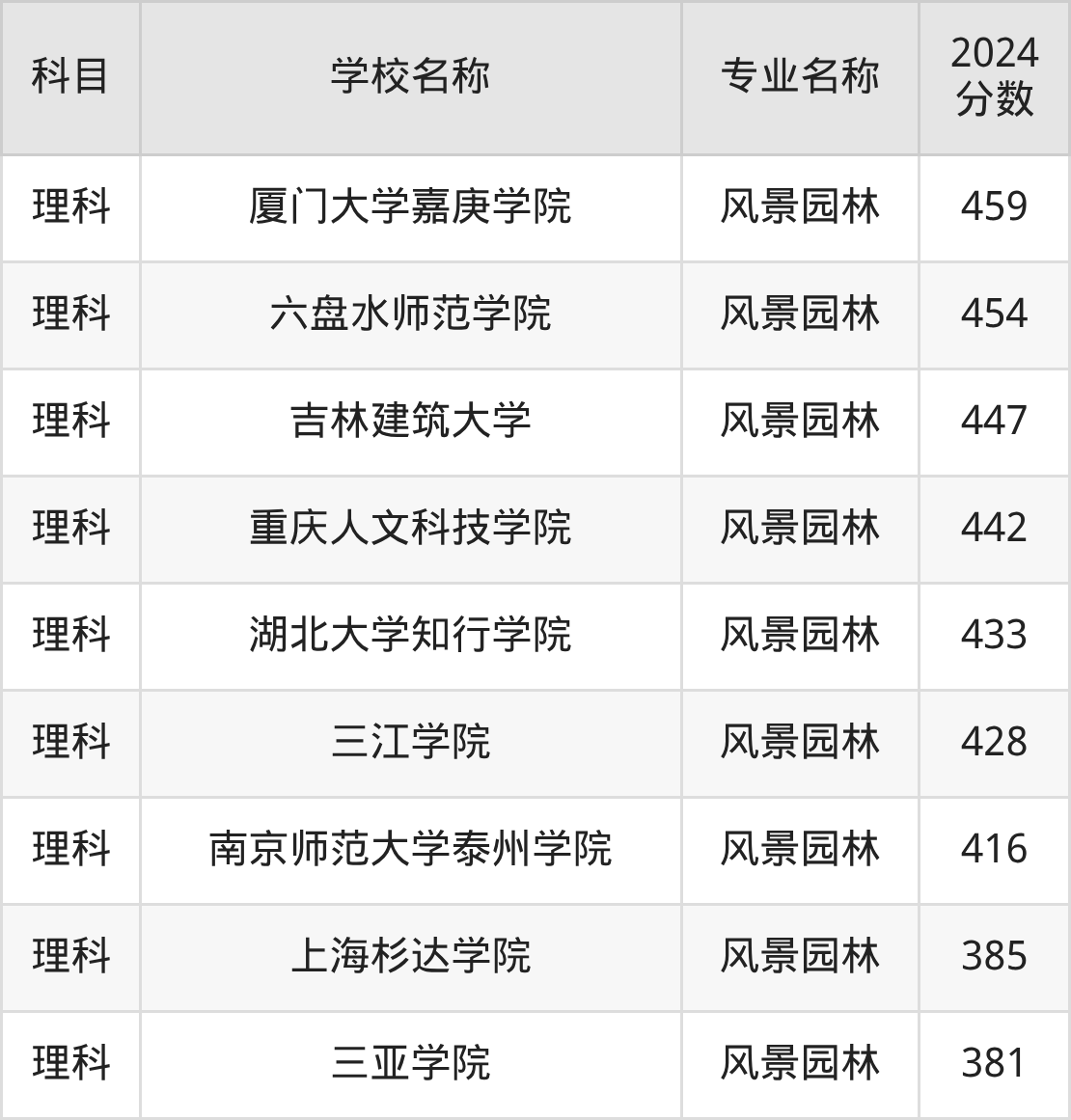 | 昆明理工大学(高等职 业教育普通本科) | 风景园林 | 450 |