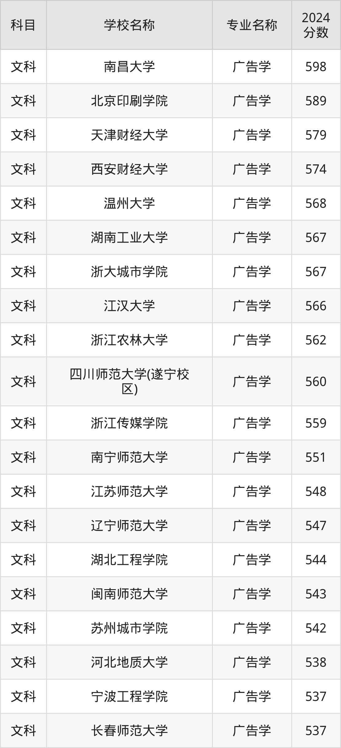 通过上文大家可以知晓,在云南省内招广告学专业的院校数量较少,所以下文将为2026届高考生继续展示:省外大学的广告学专业2024年在云南高考的录取情况,包含南昌大学、北京印刷学院、天津财经大学、西安财经大学、温州大学。