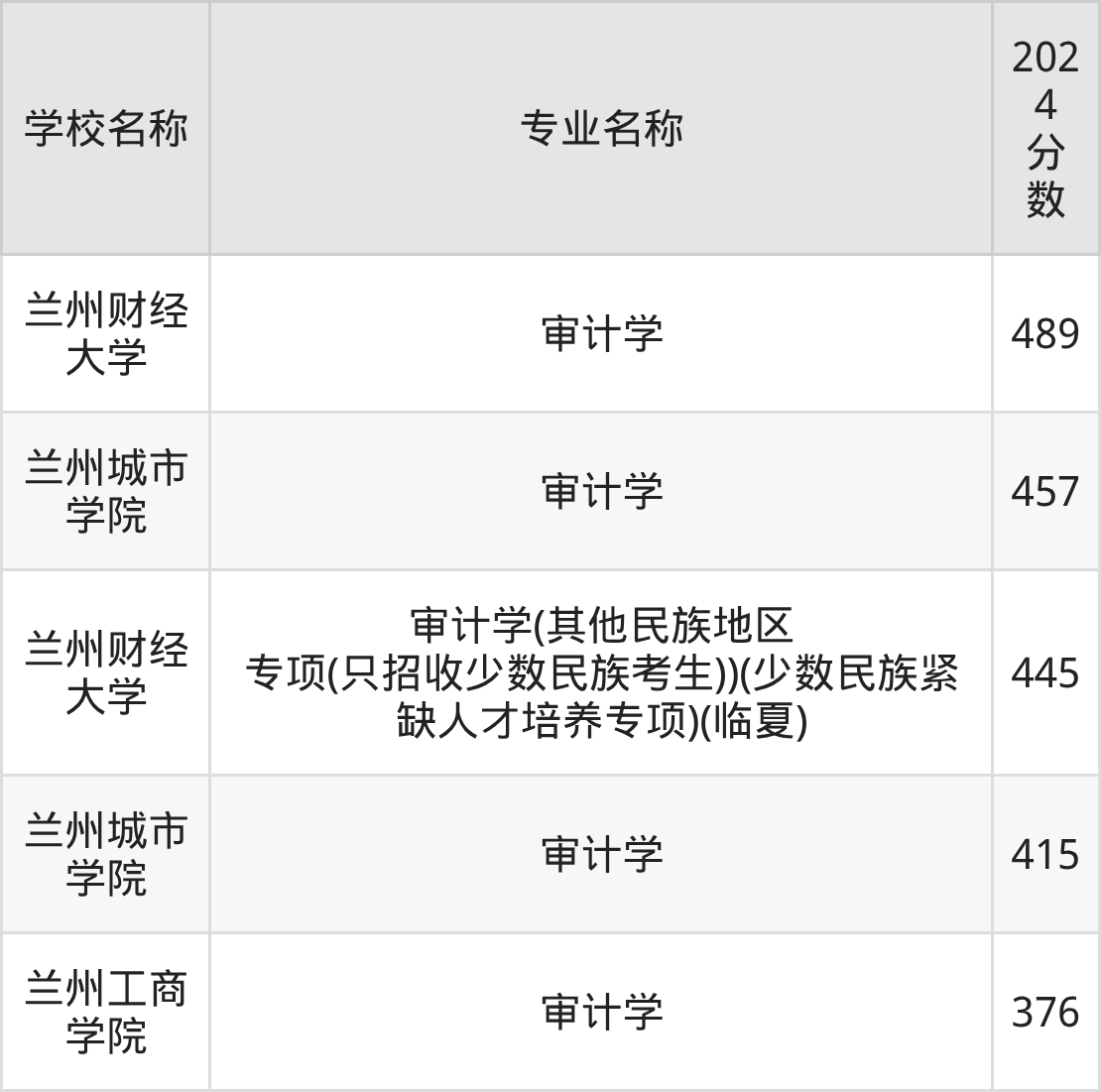 | 兰州财经大学 | 审计学(其他民 族地区专项(只 招收少数民族考 生))(少数民 族紧缺人才培养 专项)(临夏) | 459 |