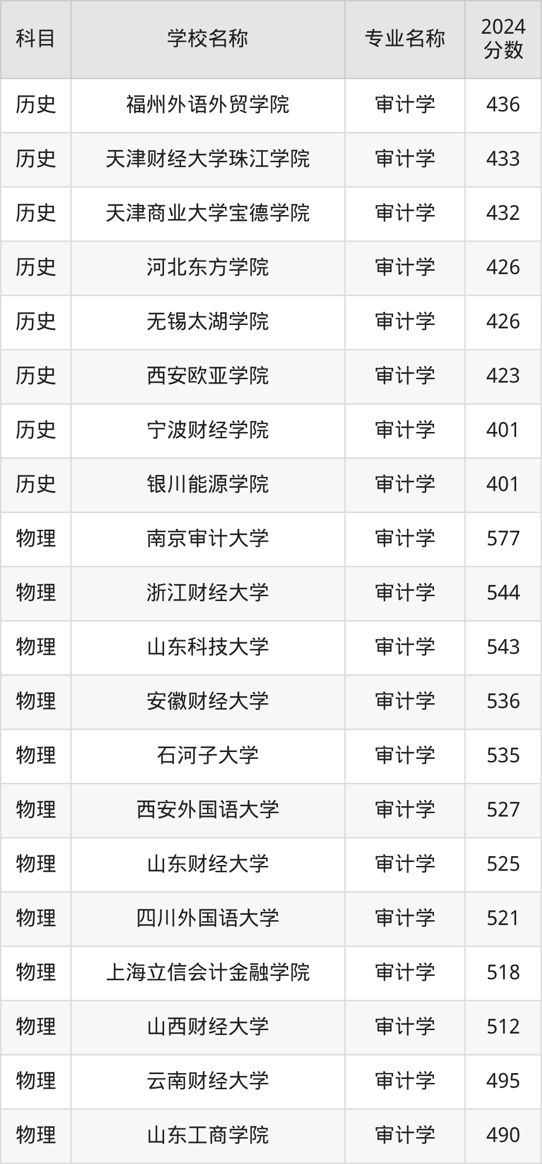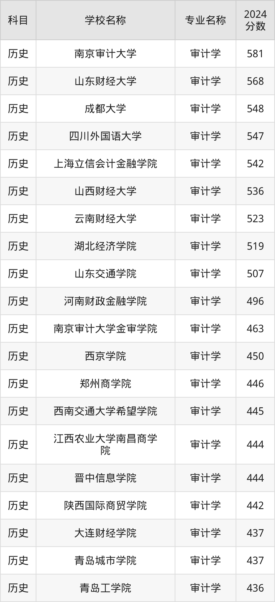 通过上文大家可以知晓,在甘肃省内招审计学专业的院校数量较少,所以下文将为2026届高考生继续展示:省外大学的审计学专业2024年在甘肃高考的录取情况,包含南京审计大学、山东财经大学、成都大学、四川外国语大学、上海立信会计金融学院。