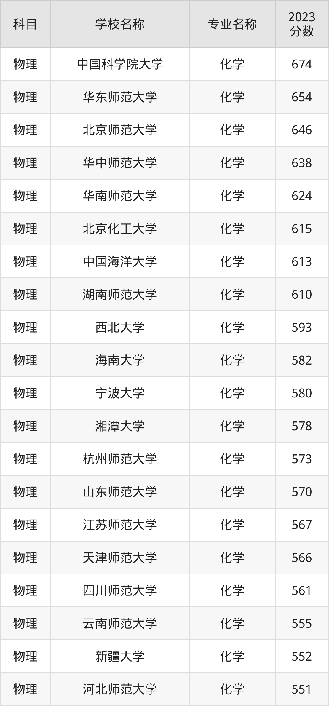 通过上文大家可以知晓,在福建省内招化学专业的院校数量较少,所以下文将为2025届高考生继续展示:省外大学的化学专业2023年在福建高考的录取情况,包含中国科学院大学、华东师范大学、北京师范大学、华中师范大学、华南师范大学。