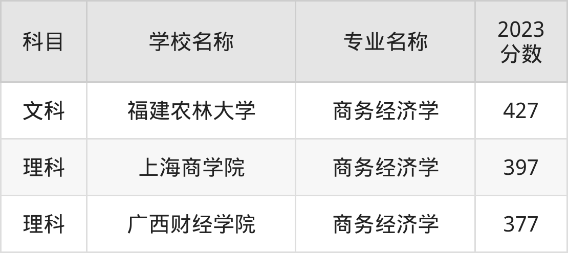 通过上文大家可以知晓,在黑龙江省内招商务经济学专业的院校数量较少,所以下文将为2025届高考生继续展示:省外大学的商务经济学专业2023年在黑龙江高考的录取情况,包含福建农林大学、上海商学院、广西财经学院。