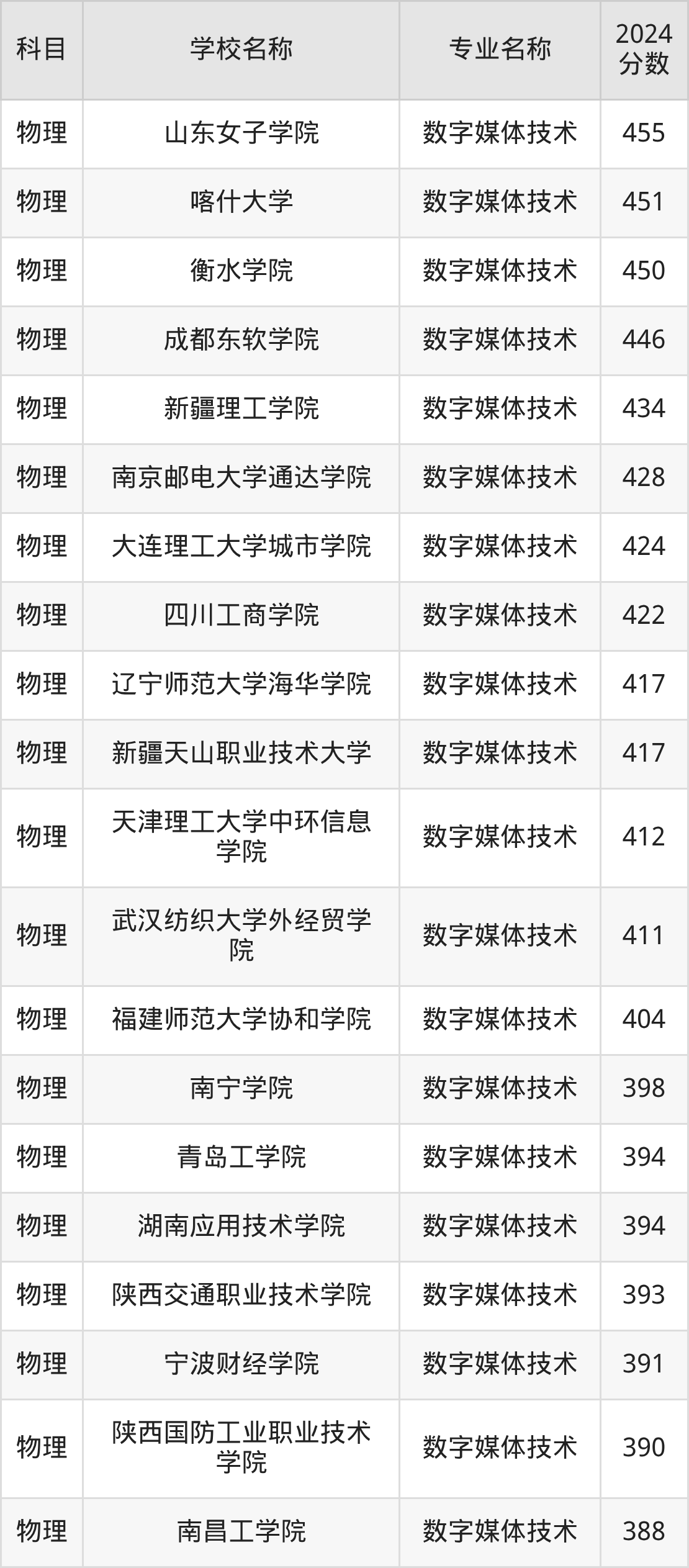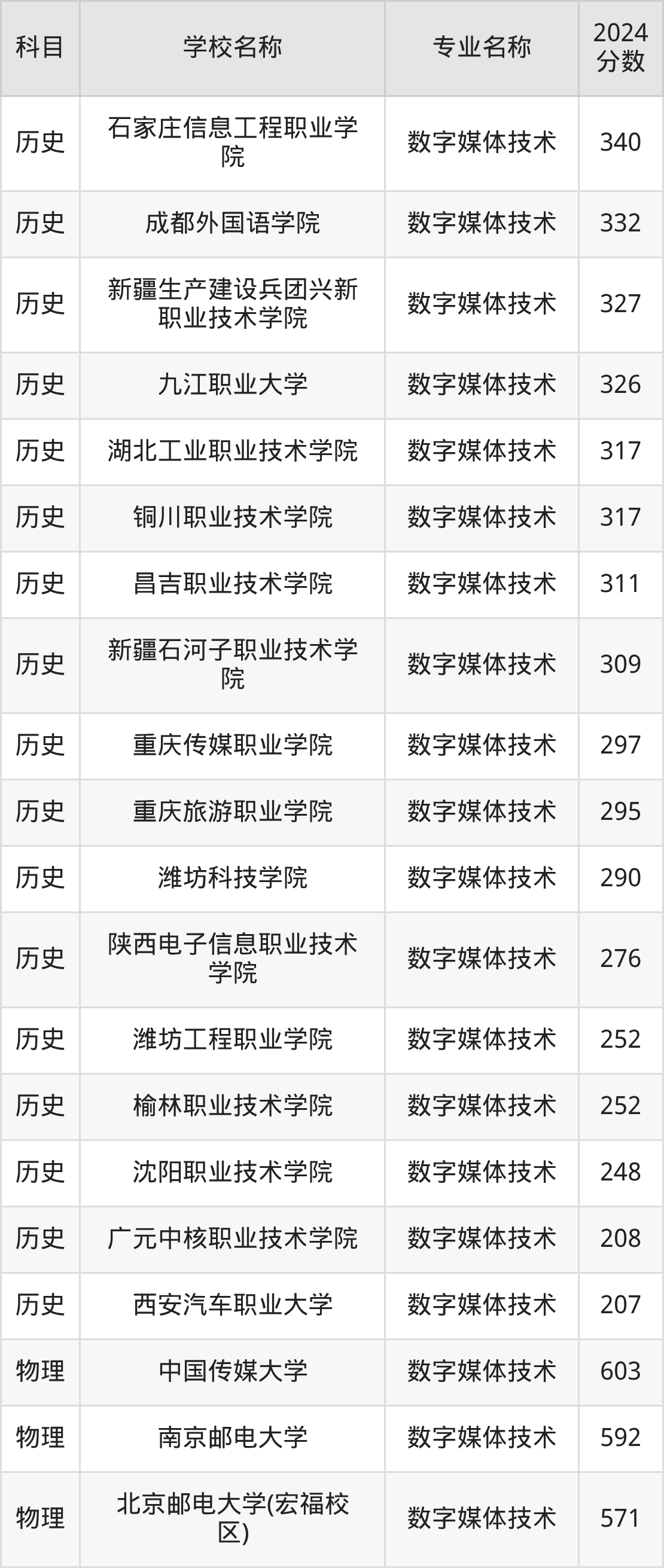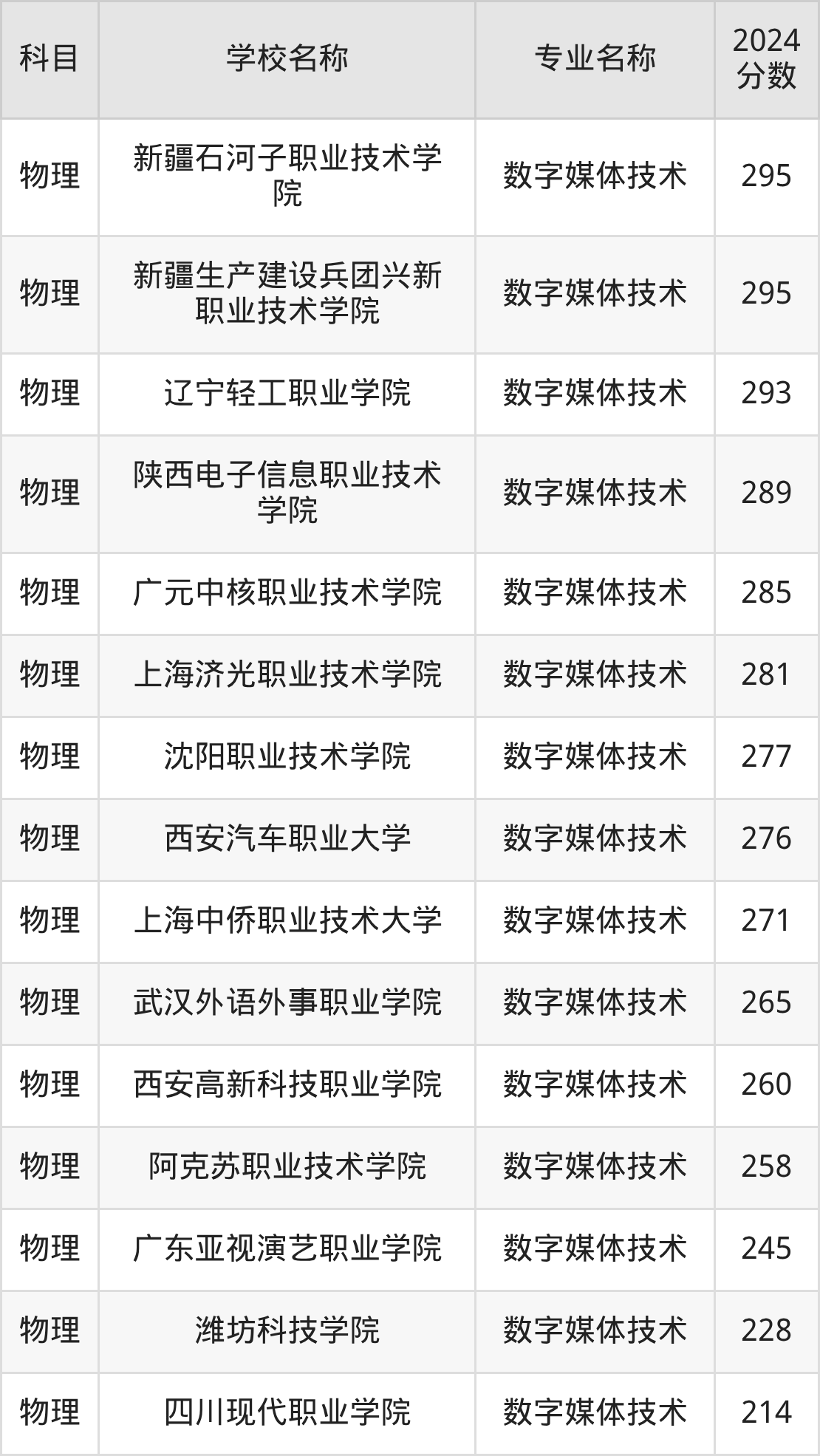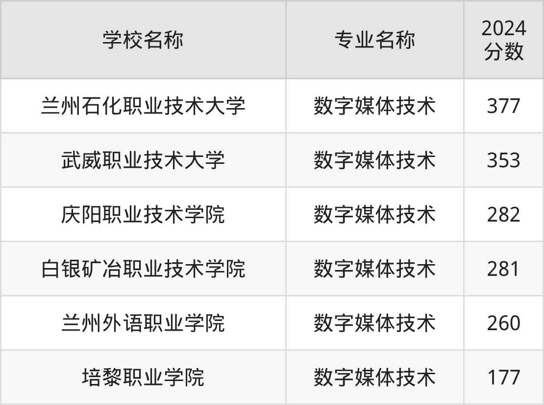 通过上文大家可以知晓,在甘肃省内招数字媒体技术专业的院校数量较少,所以下文将为2026届高考生继续展示:省外大学的数字媒体技术专业2024年在甘肃高考的录取情况,包含淄博职业技术大学、福州英华职业学院、湖南大众传媒职业技术学院、上海电子信息职业技术学院、湖南铁道职业技术学院。