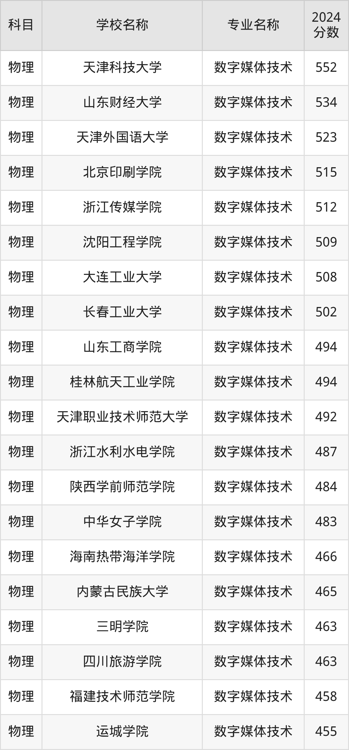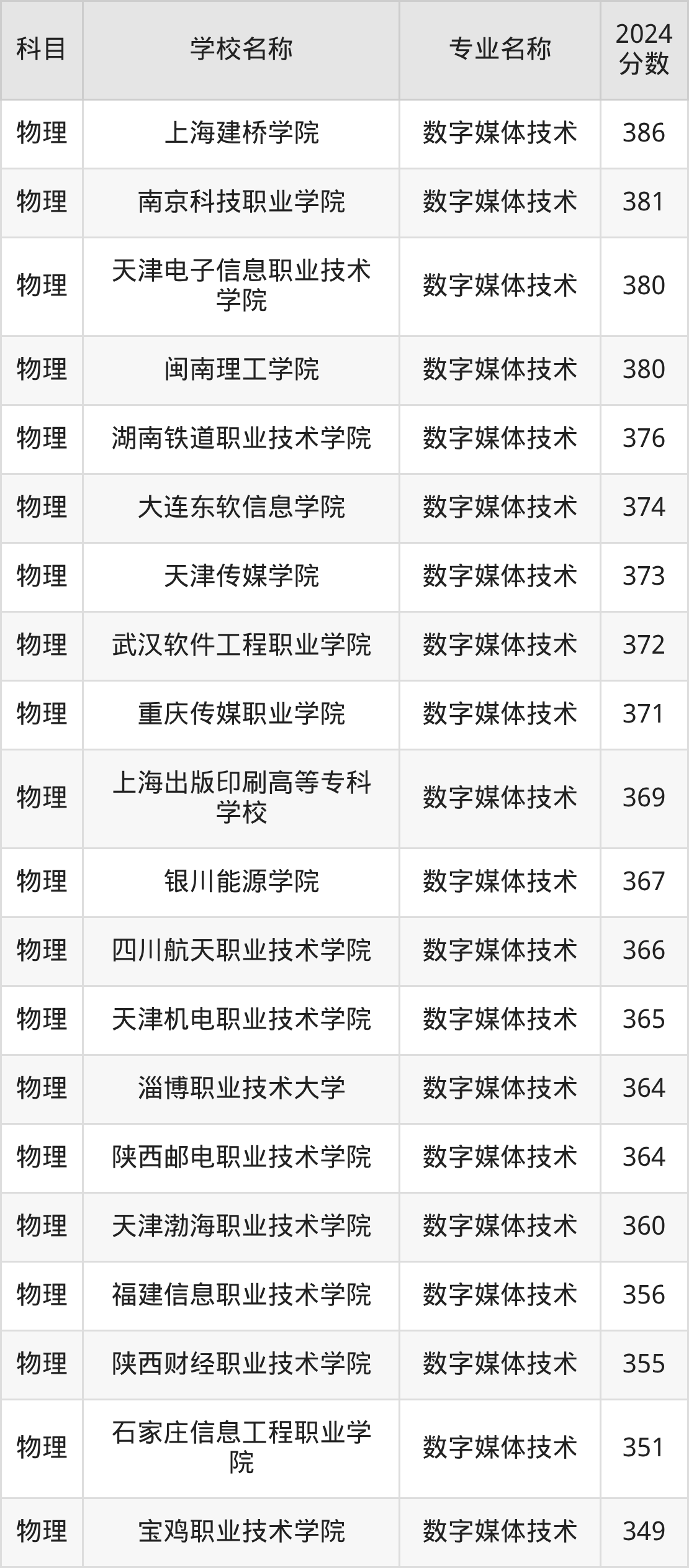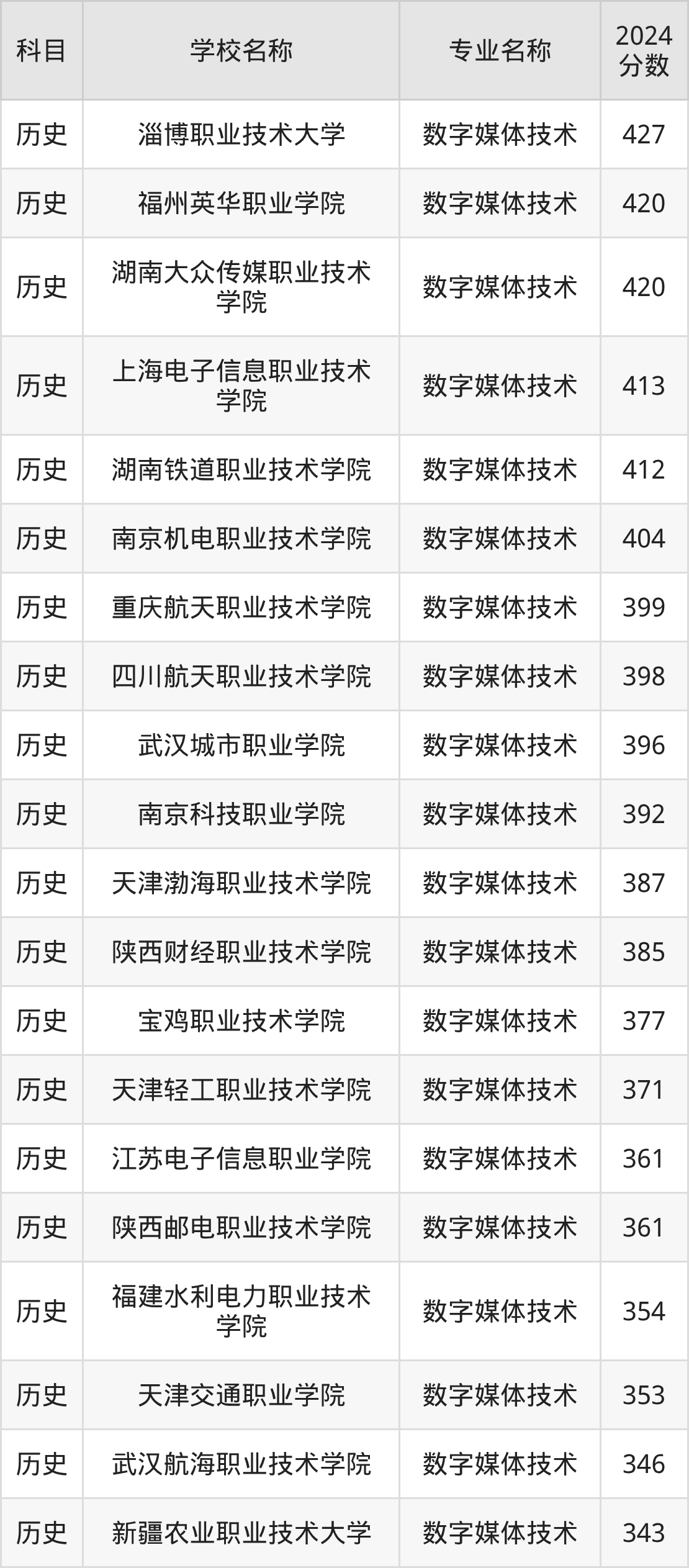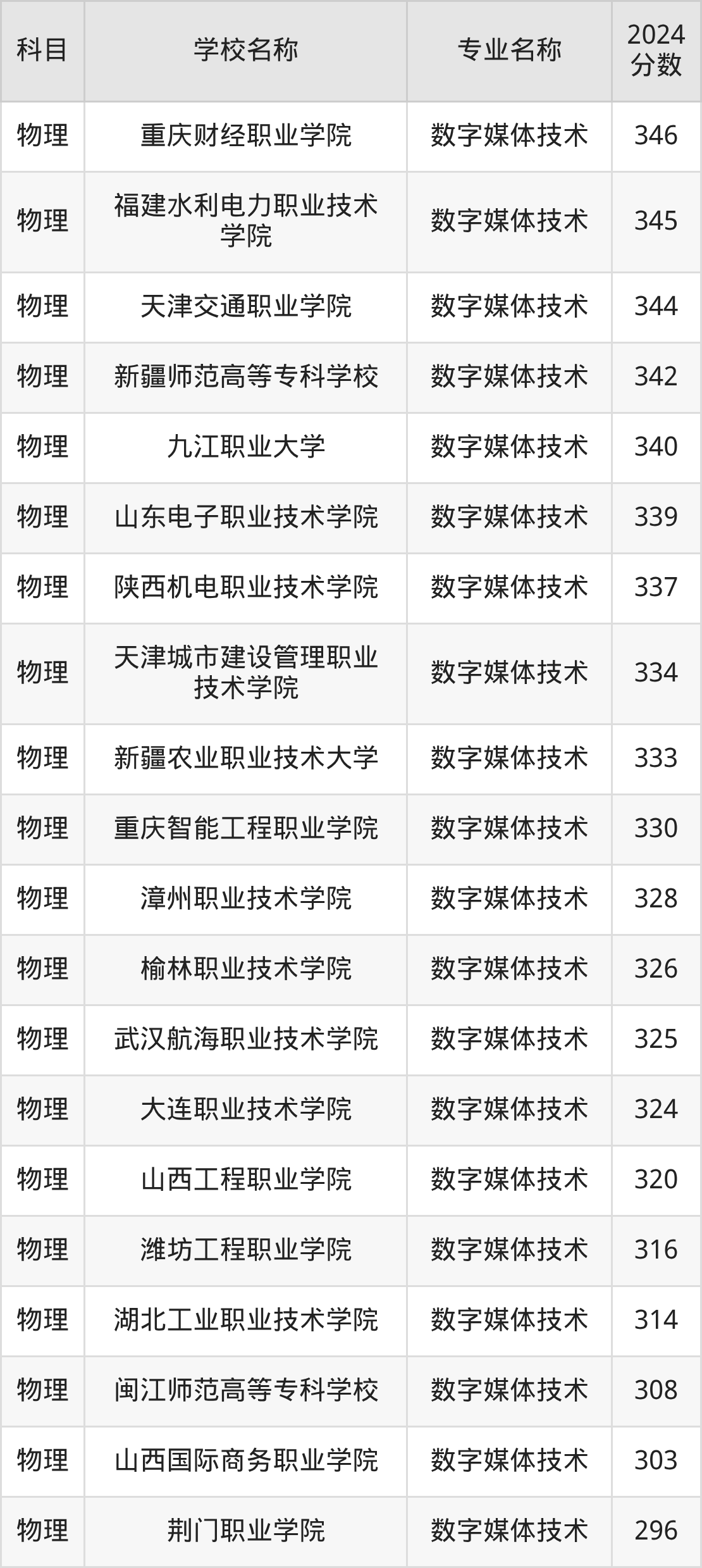 通过上文大家可以知晓,在甘肃省内招数字媒体技术专业的院校数量较少,所以下文将为2026届高考生继续展示:省外大学的数字媒体技术专业2024年在甘肃高考的录取情况,包含淄博职业技术大学、福州英华职业学院、湖南大众传媒职业技术学院、上海电子信息职业技术学院、湖南铁道职业技术学院。