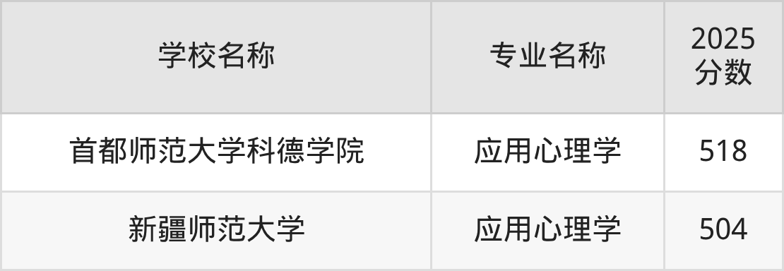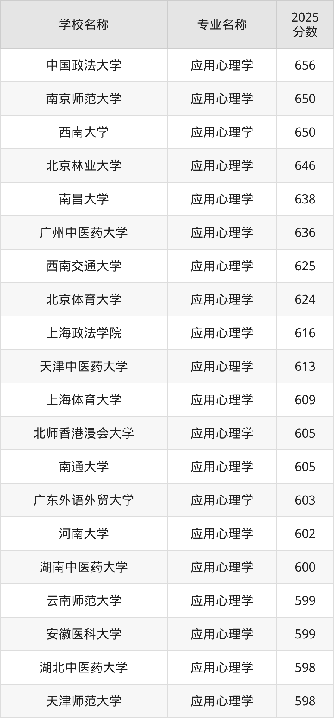 通过上文大家可以知晓,在浙江省内招应用心理学专业的院校数量较少,所以下文将为2026届高考生继续展示:省外大学的应用心理学专业2025年在浙江高考的录取情况,包含中国政法大学、南京师范大学、西南大学、北京林业大学、南昌大学。