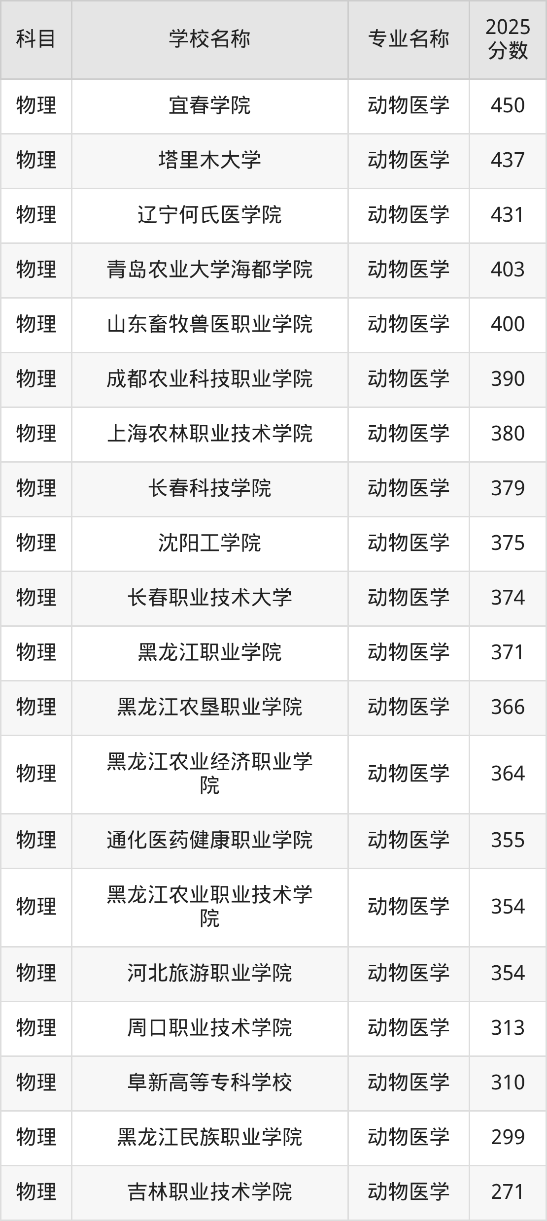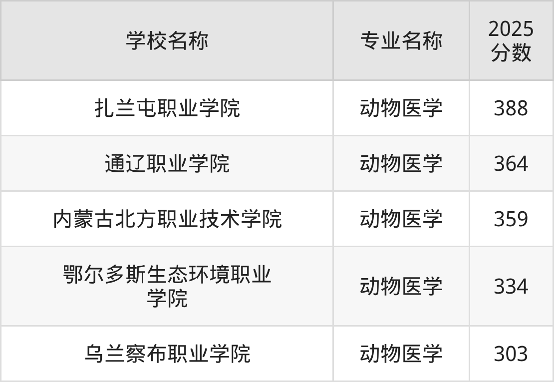 | 扎兰屯职业学院 | 动物医学 | 340 |