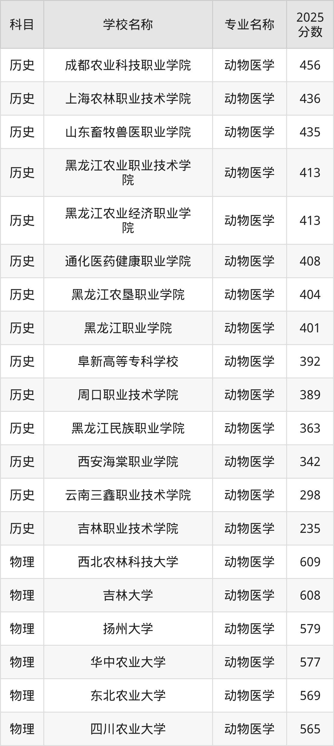 通过上文大家可以知晓,在内蒙古自治区内招动物医学专业的院校数量较少,所以下文将为2026届高考生继续展示:自治区外大学的动物医学专业2025年在内蒙古高考的录取情况,包含成都农业科技职业学院、上海农林职业技术学院、山东畜牧兽医职业学院、黑龙江农业职业技术学院、黑龙江农业经济职业学院。